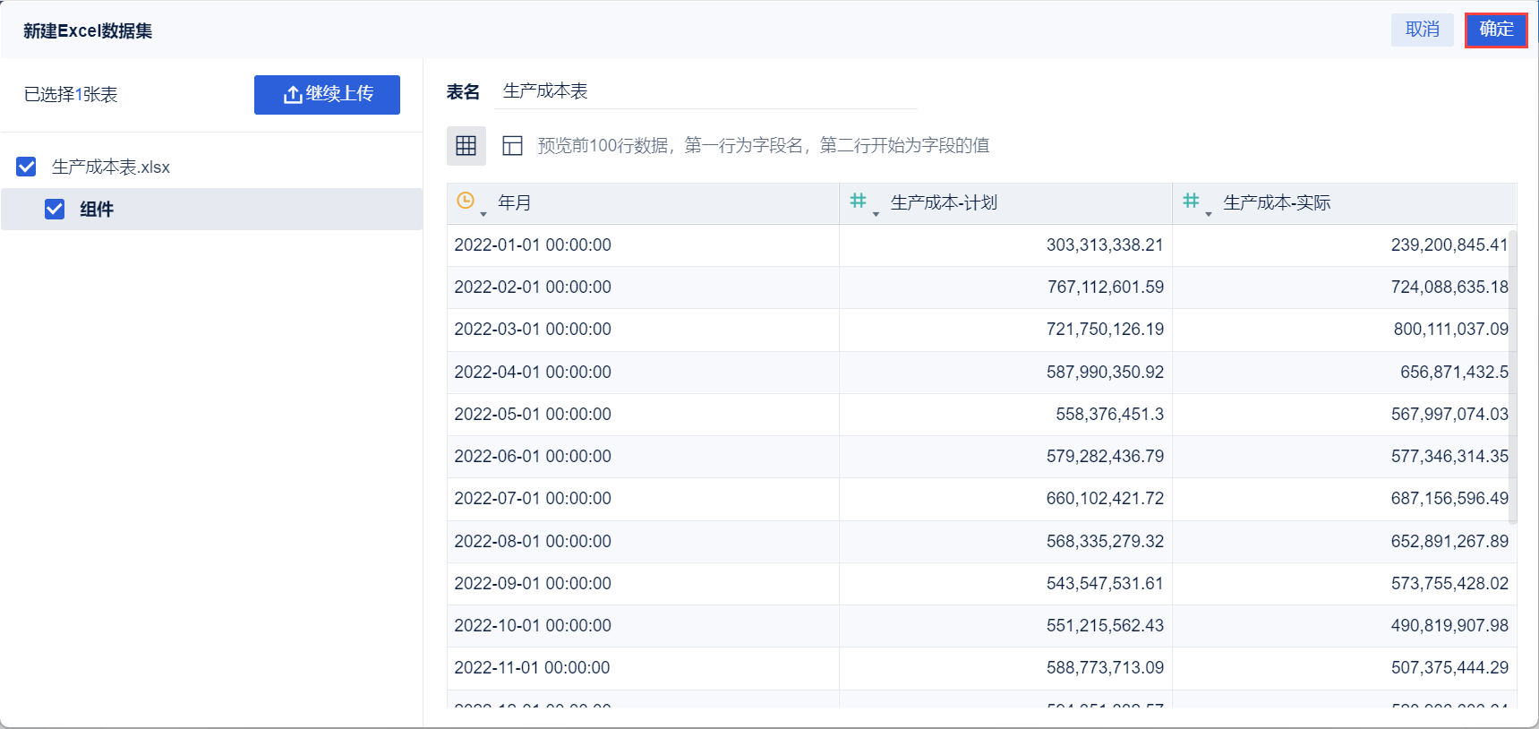 2)点击「本地Excel文件>上传数据」,上传表数据。如下图所示: