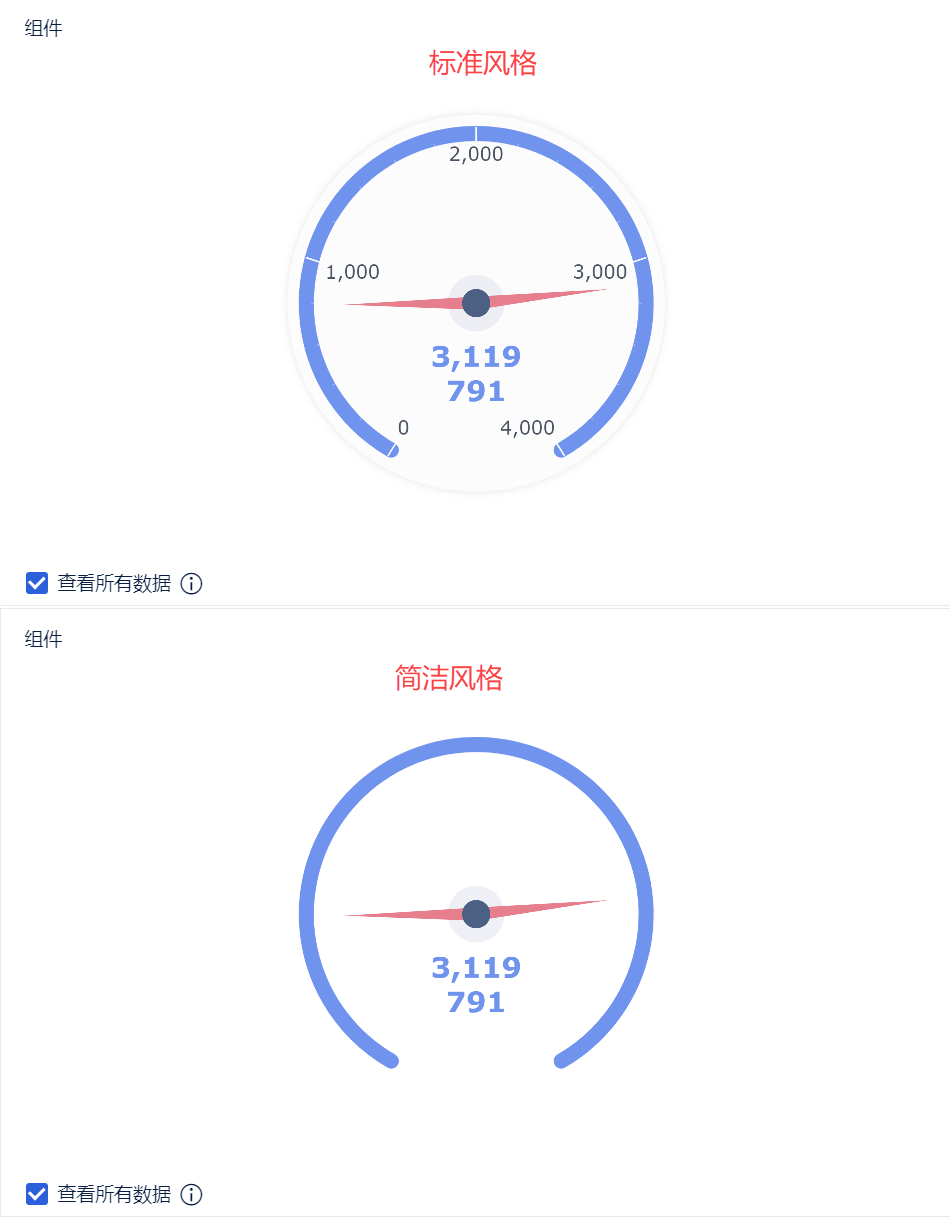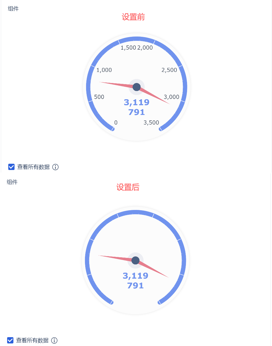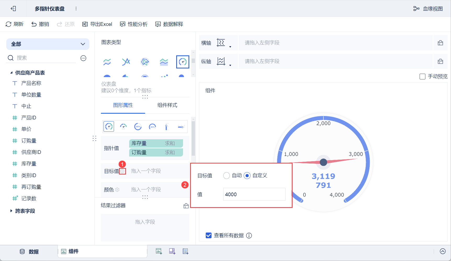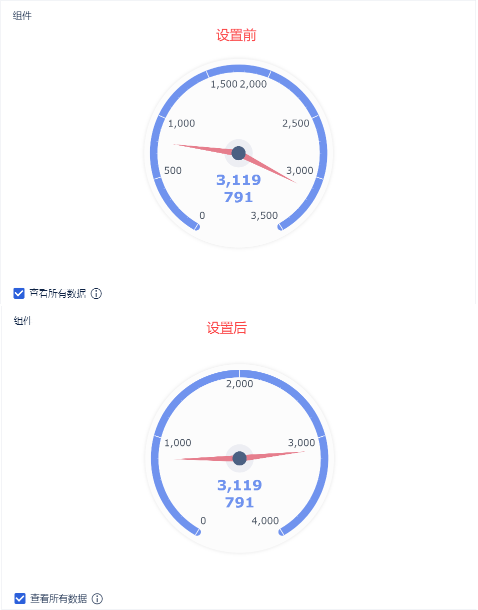 1)多指针仪表盘 和 试管型仪表盘 中,「目标值」即仪表盘的最大刻度值,可通过修改「目标值」调整最大刻度值。以多指针仪表盘为例,设置目标值为「4000」,如下图所示: