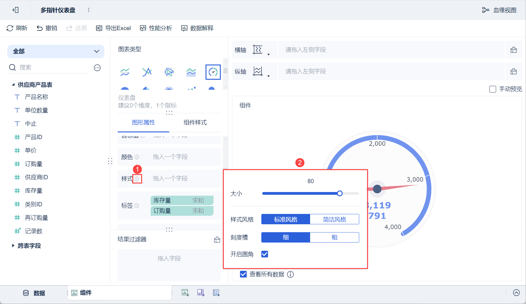 1)6.0.15 及之后的版本仪表盘支持设置「样式」,点击样式设置按钮,可修改仪表盘的大小、风格、刻度槽粗细、是否开启圆角等。以多刻度仪表盘为例,如下图所示: