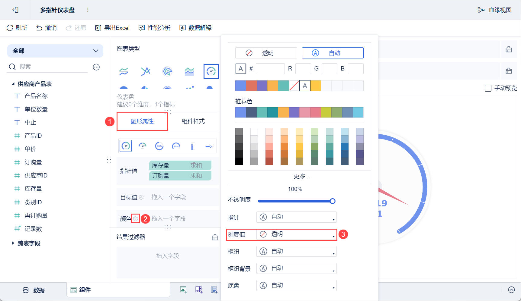 仪表盘的颜色与拖入颜色栏中的字段和指针值栏中的字段有关。具体关联是:颜色栏中拖入一个字段,点击颜色设置按钮,在弹出的设置框中设置连续渐变或区域渐变,自动或自定义,确定一个颜色的区间范围,再根据「指针值」大小找到对应范围的映射。