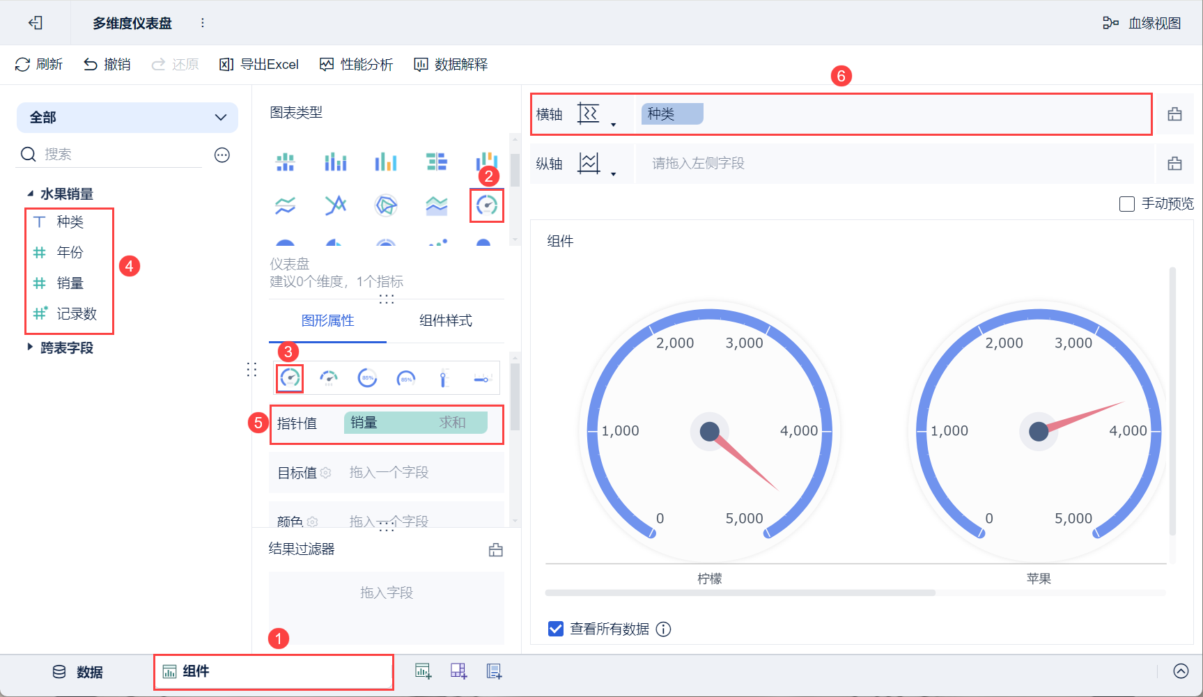 2)例如,展示三个种类水果的销量,在组件编辑界面,选择图表类型为「仪表盘」,图表子类型选择第一个,左侧待分析区域的「销量」拖入「图形属性」下的指针值栏,「种类」拖入分析区域的横轴,如下图所示: