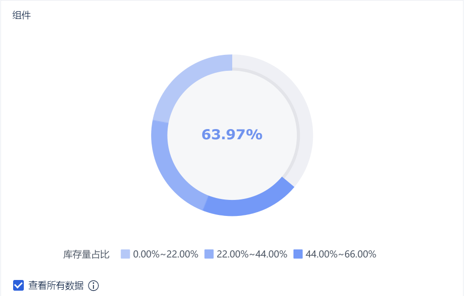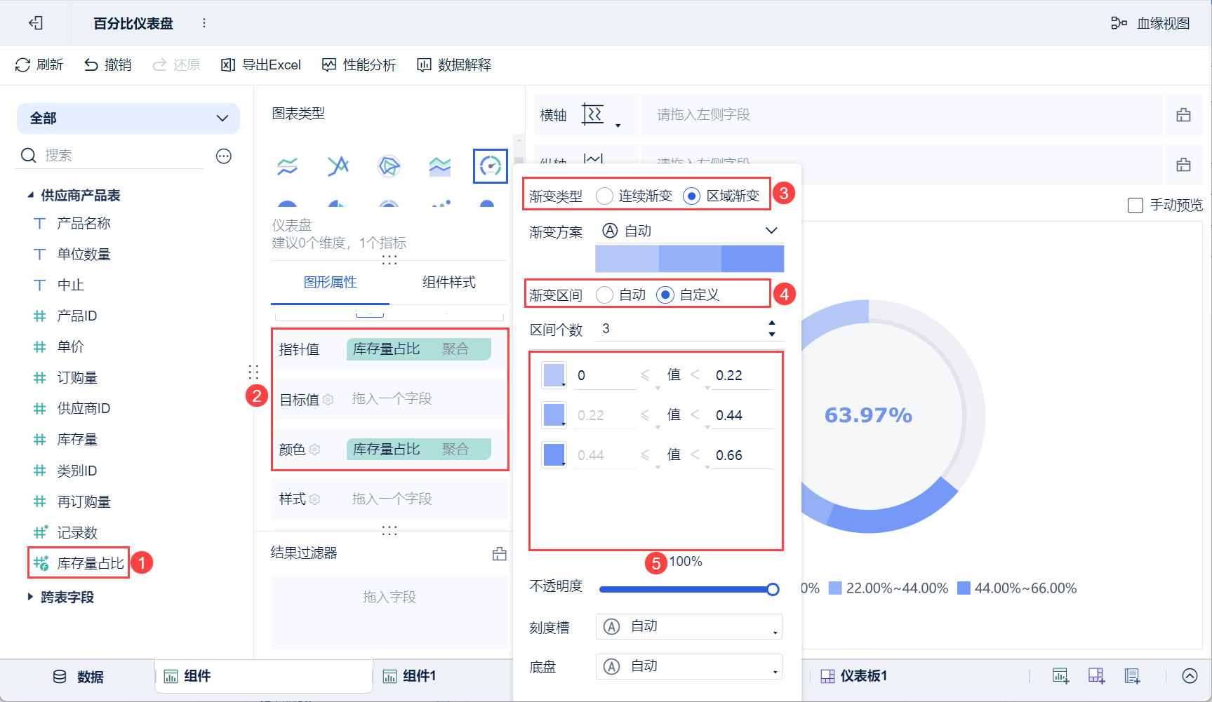 以百分比圆环仪表盘为例说明。例如,颜色栏和指针值栏都拖入「库存量占比」,渐变类型勾选「区域渐变」,渐变区间勾选「自定义」,区间个数为「3」,0-0.22、0.22-0.44、0.44-0.66,对应为「浅蓝-中蓝-深蓝」,再根据「指针值」大小找到对应范围的映射,比如指针值大小为 63.97%,仪表盘上显示为「浅蓝-中蓝-深蓝」。