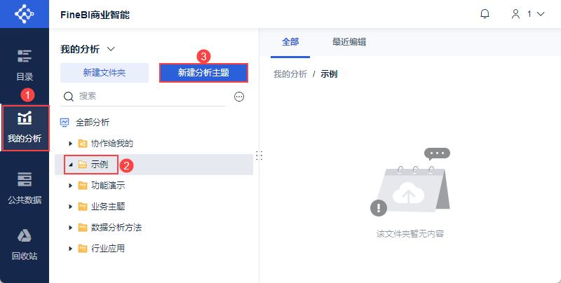 1)用户登录 FineBI 系统,点击「我的分析」,选中某个文件夹,点击「新建分析主题」,如下图所示: