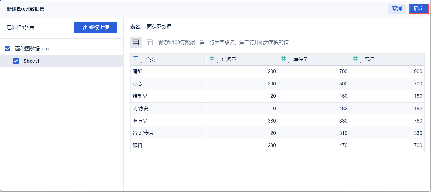 2)点击「本地Excel文件>上传数据」,上传表数据。如下图所示: