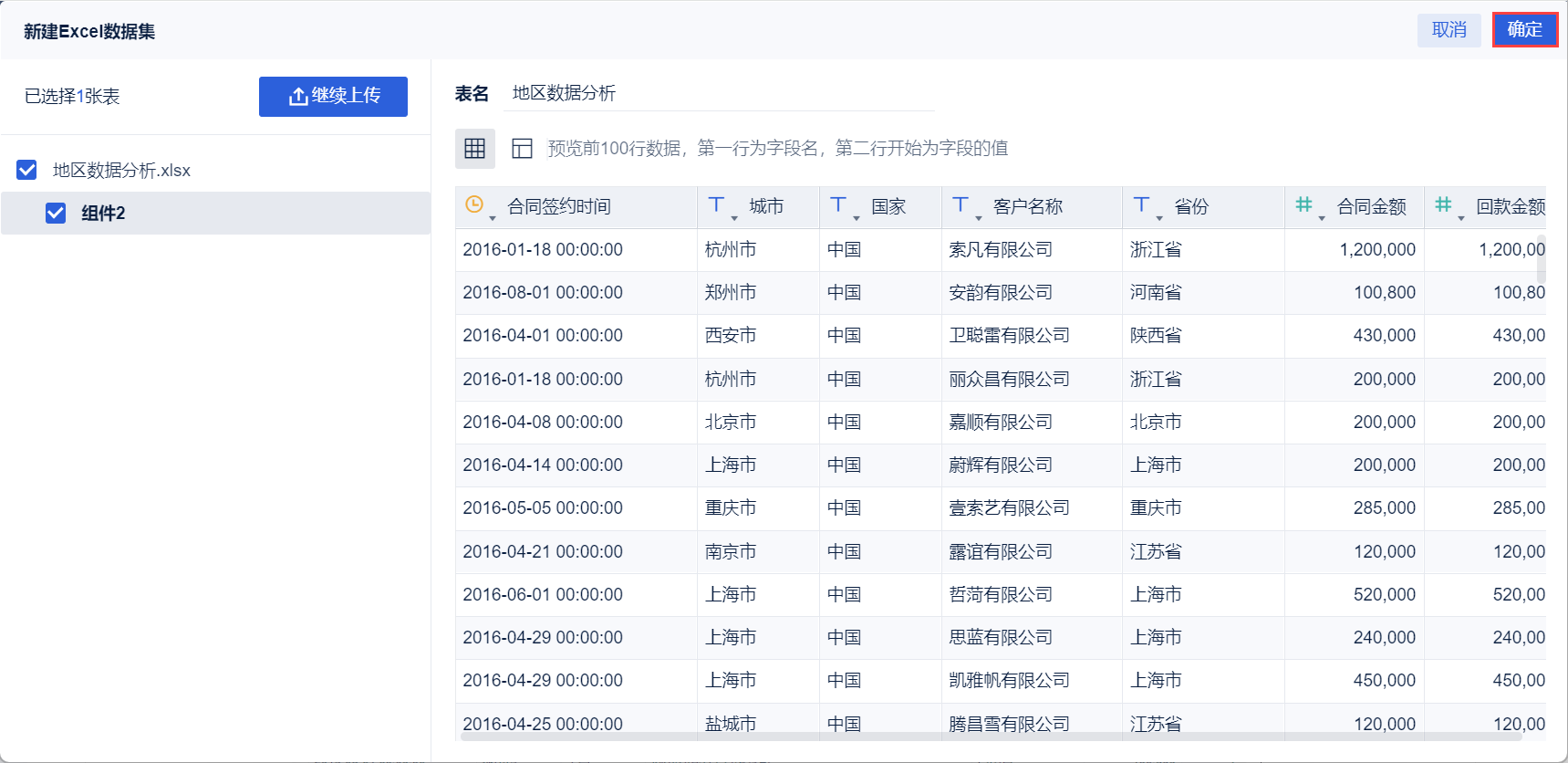2)点击「本地Excel文件>上传数据」,上传表数据。如下图所示: