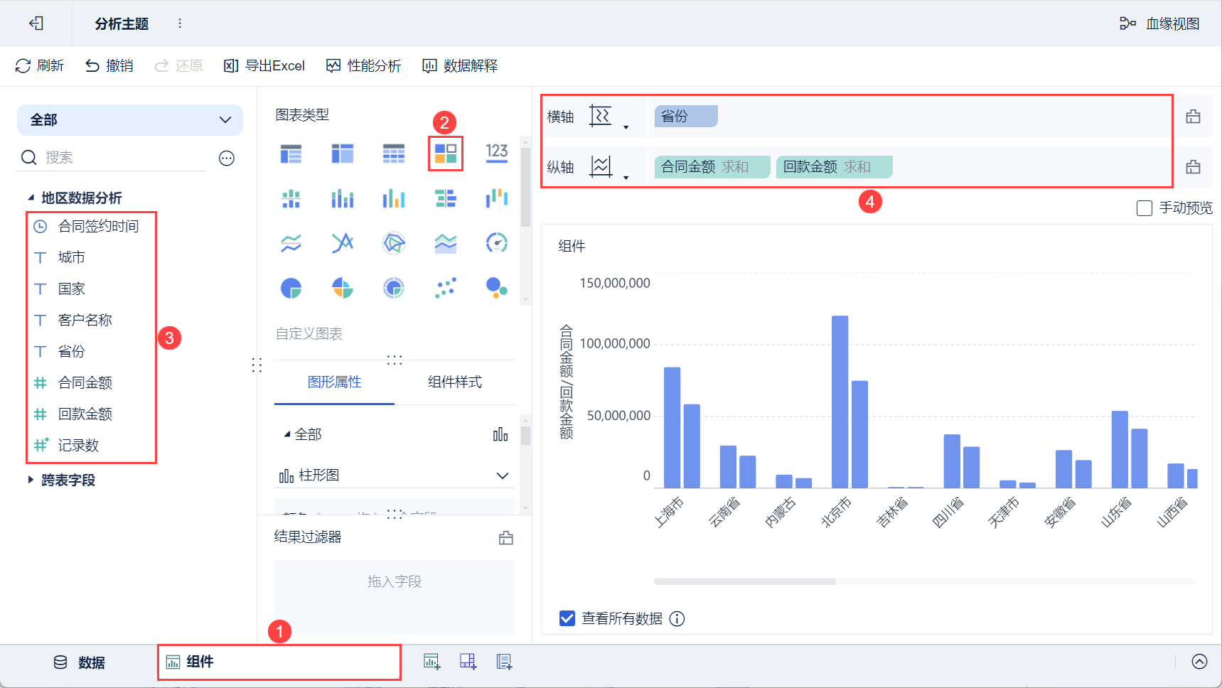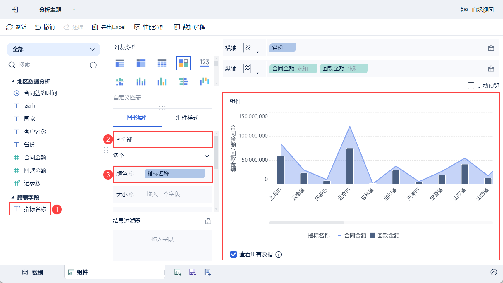3)将左侧待分析区域的「省份」拖入分析区域的横轴,「合同金额」、「回款金额」拖入纵轴,如下图所示: