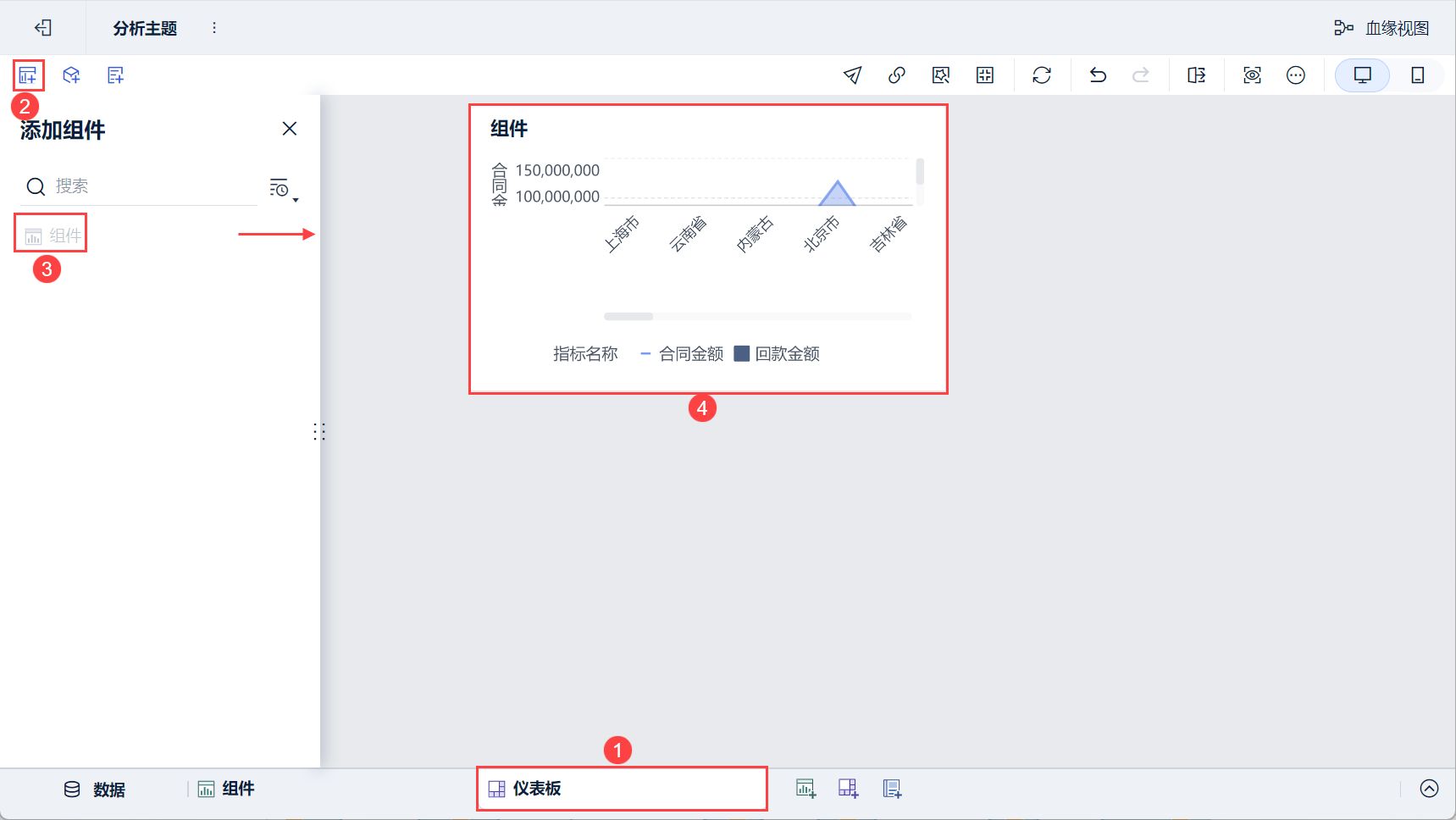 2)进入仪表板编辑界面,将组件拖入至仪表板中,如下图所示: