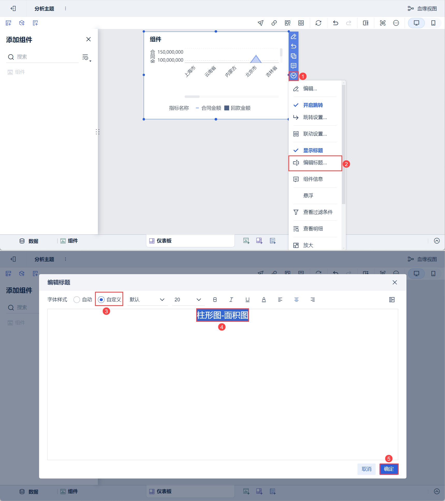 3)下拉选择「编辑标题」,样式选择「自定义」,设置标题为「柱形图-面积图」,点击「确定」。如下图所示: