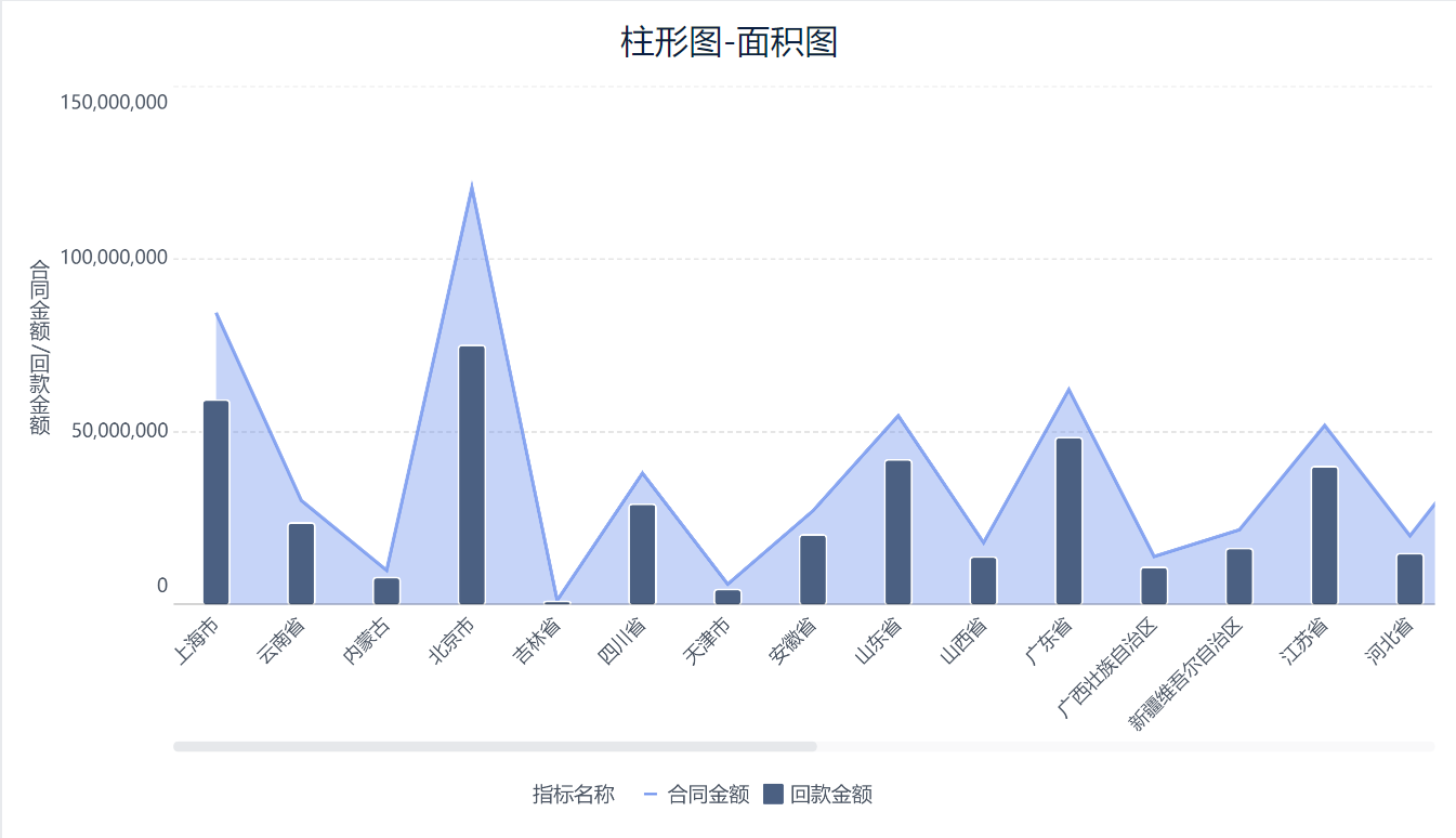例如,用柱形图-面积图展示不同省份的合同金额和回款金额的数据大小、累积效应及变化趋势,如下图所示: