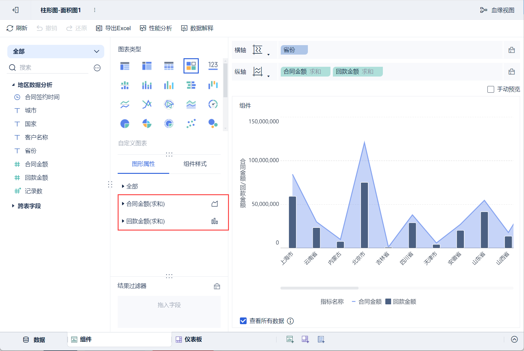 4)点击「图形属性>合同金额」,选择合同金额的形状为「面积」,柱形图-面积图组件创建成功,如下图所示: