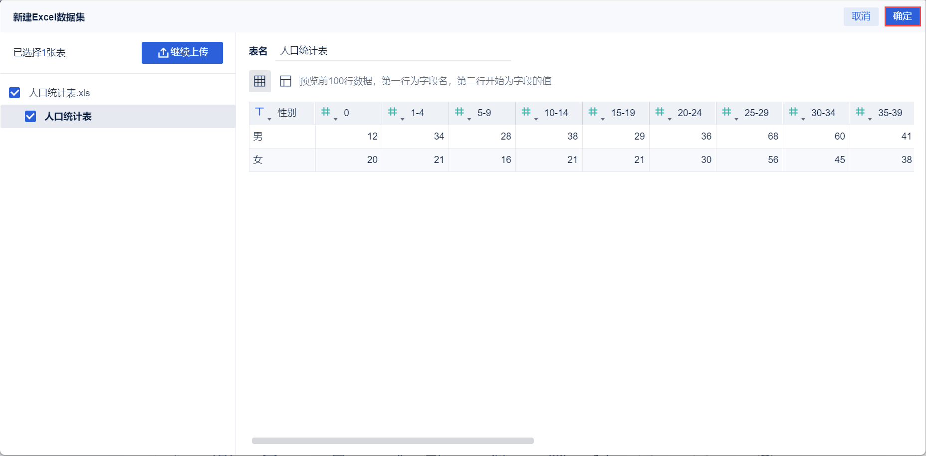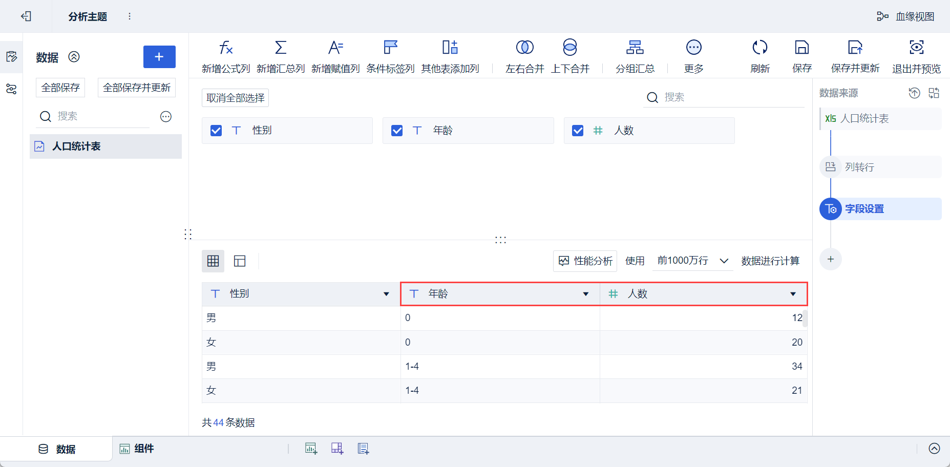 5)双击表头刚刚转成行的字段,重命名为「年龄」和「人数」,如下图所示: