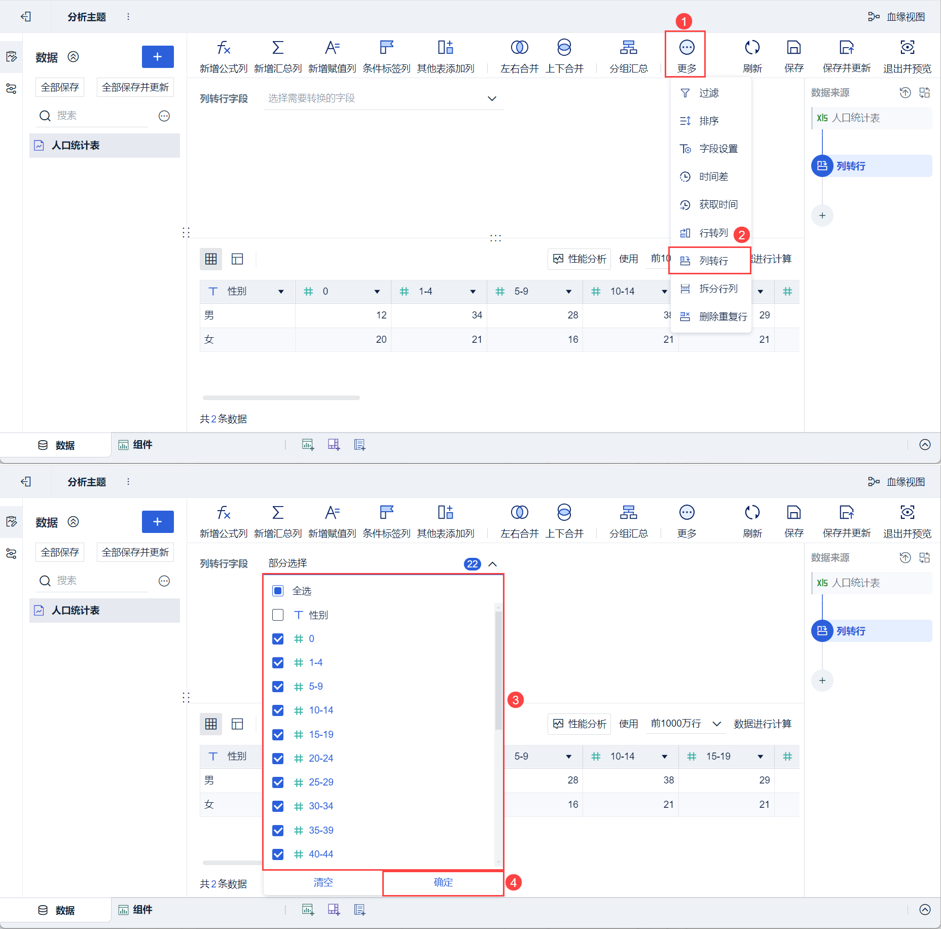 4)点击功能栏的「更多」,选择「列转行」,添加非「性别」列所有字段进行列转行,点击「确定」,如下图所示: