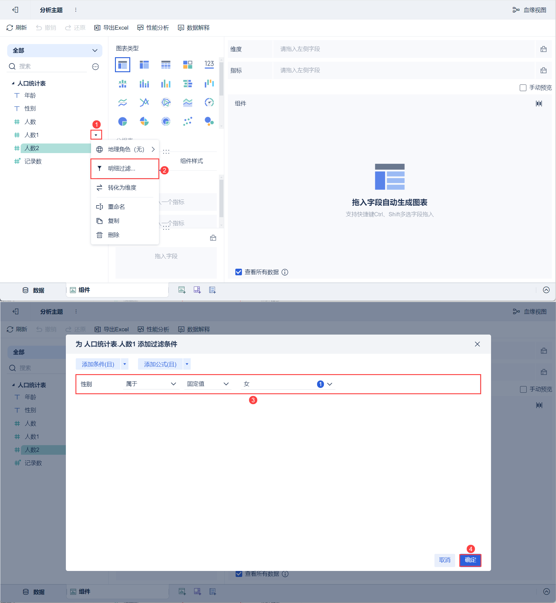 3)点击复制的「人数1」下拉按钮,选择「明细过滤」,在弹出的设置框中添加过滤条件,过滤出性别为「女」的人数数据,如下图所示: