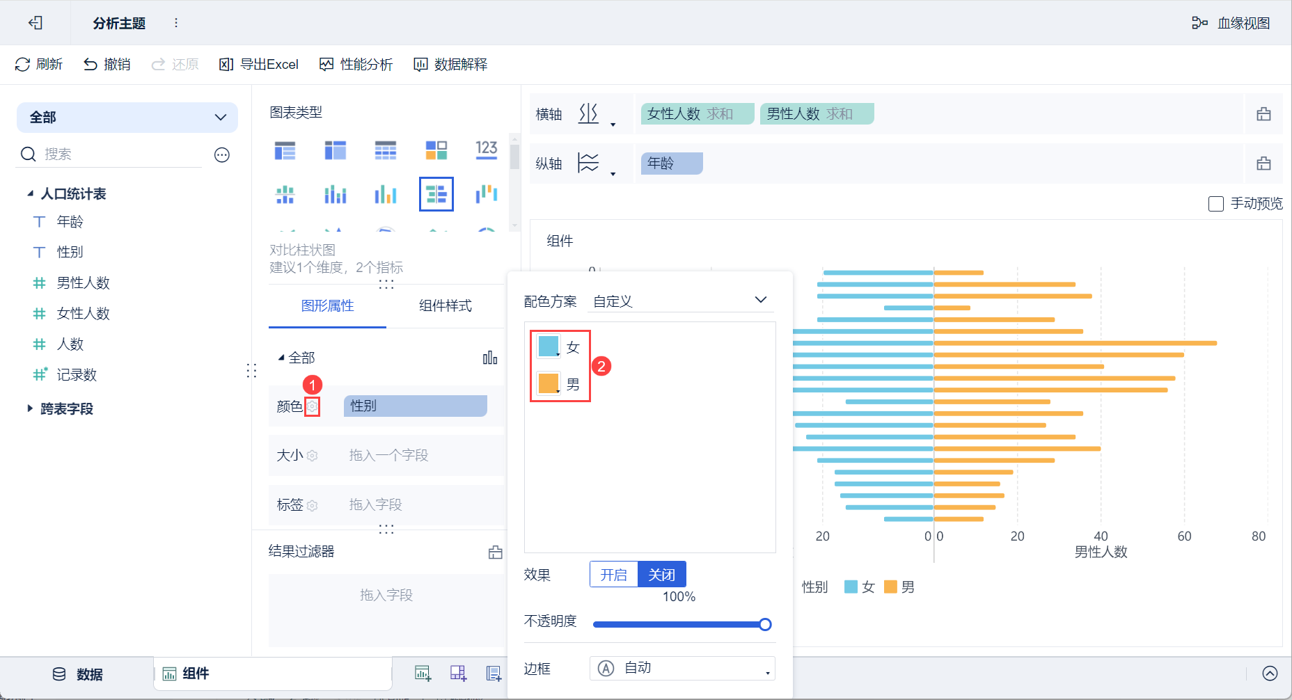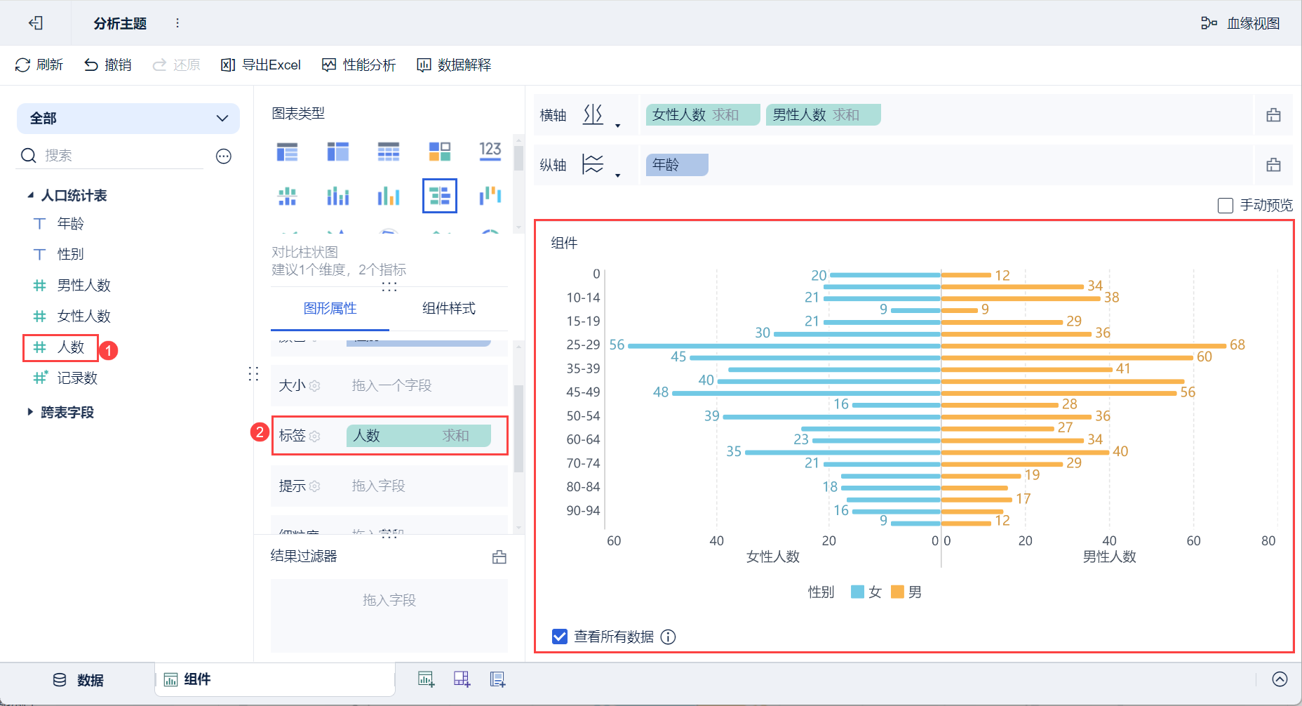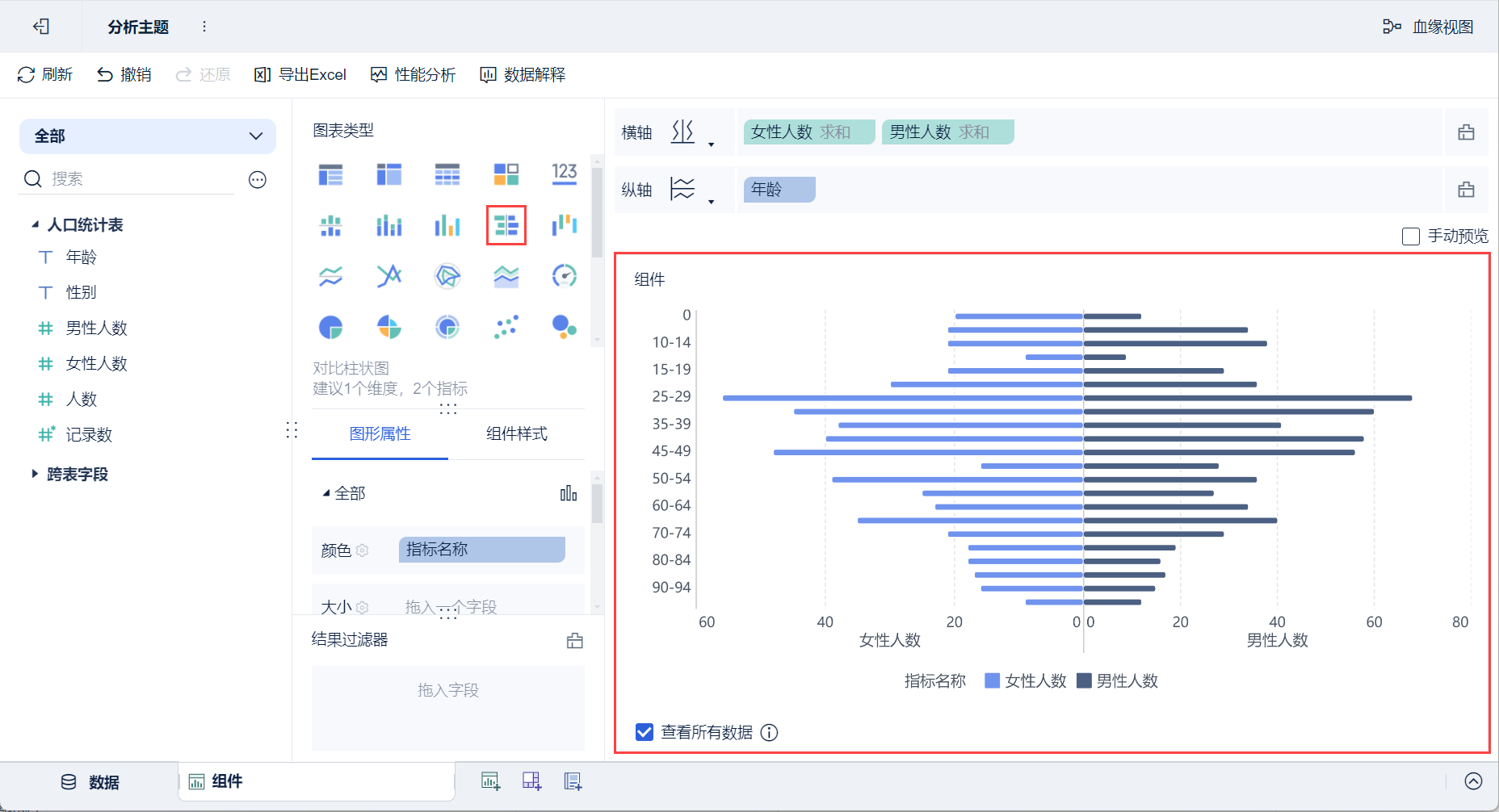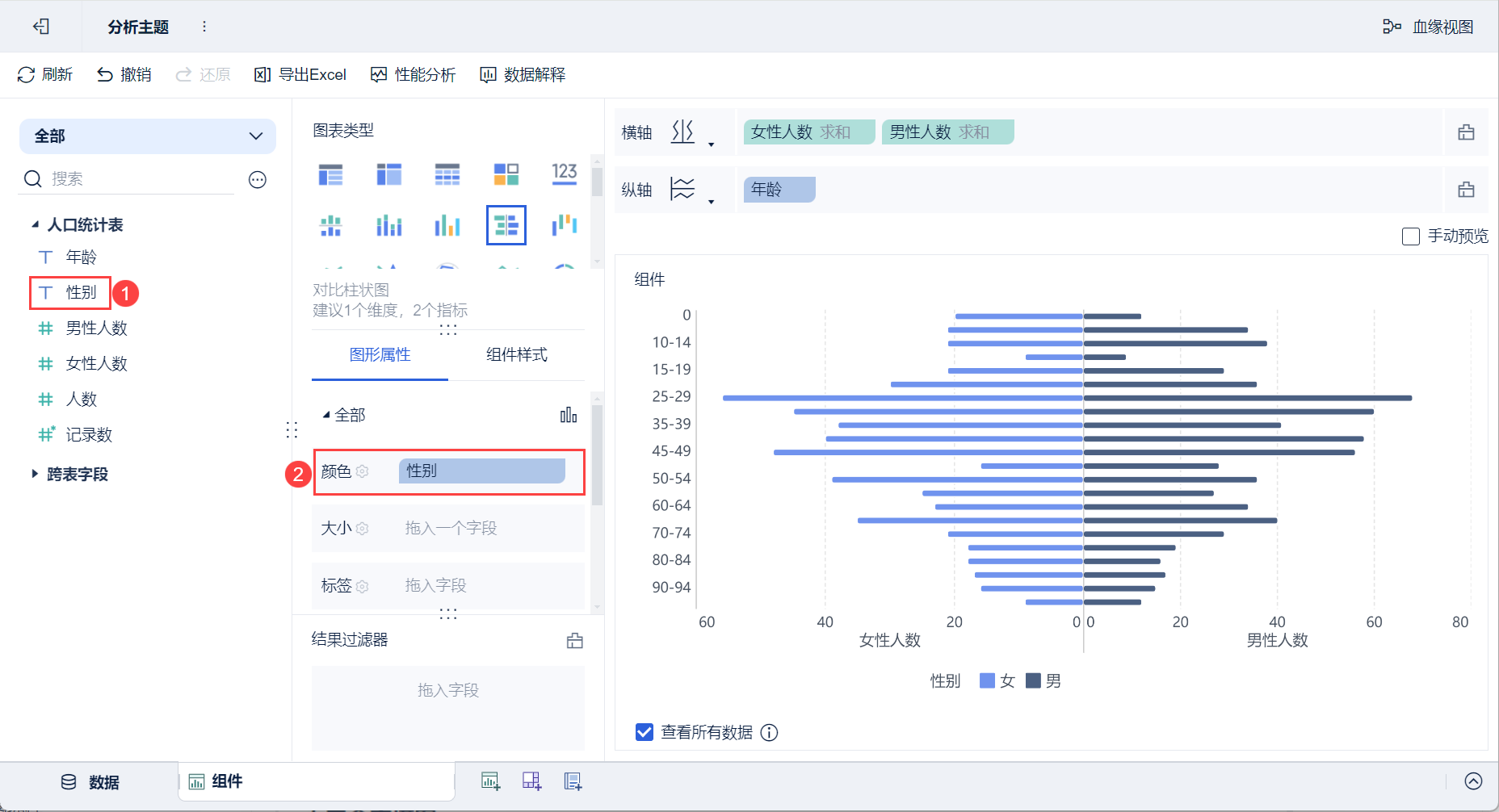 6)图表类型下选择「对比柱状图」,待分析区域的「女性人数」和「男性人数」拖入横轴,「年龄」拖入纵轴,如下图所示: