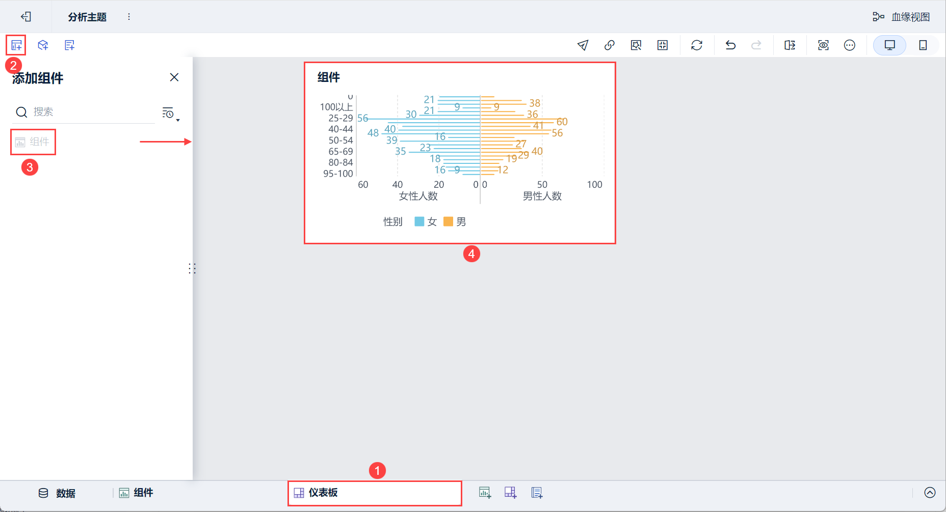 2)进入仪表板编辑界面,将组件拖入至仪表板中,如下图所示: