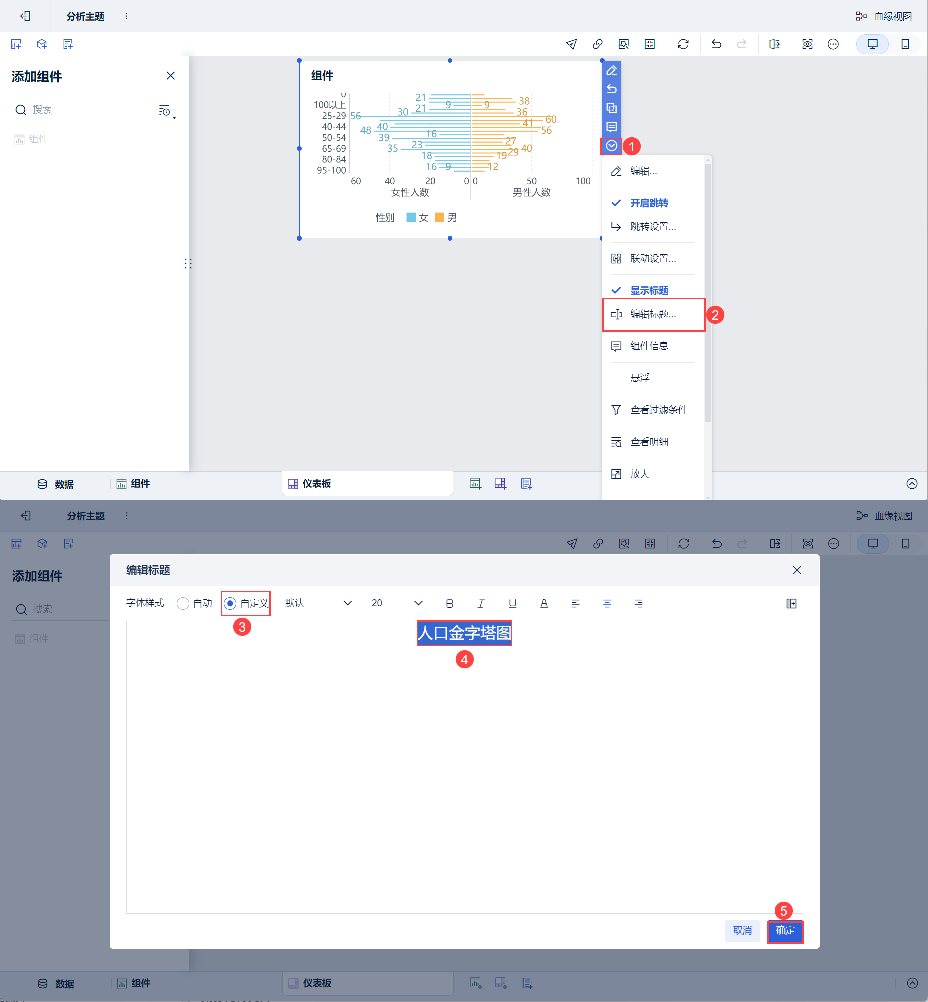 3)下拉选择「编辑标题」,样式选择「自定义」,设置标题为「人口金字塔图」,点击「确定」。如下图所示: