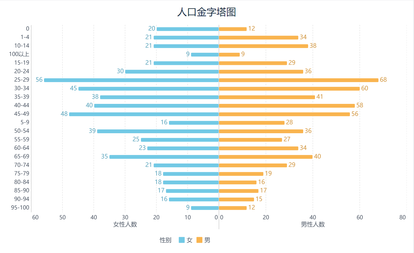 例如,用人口金字塔图展示不同年龄段的女性和男性人口分布情况: