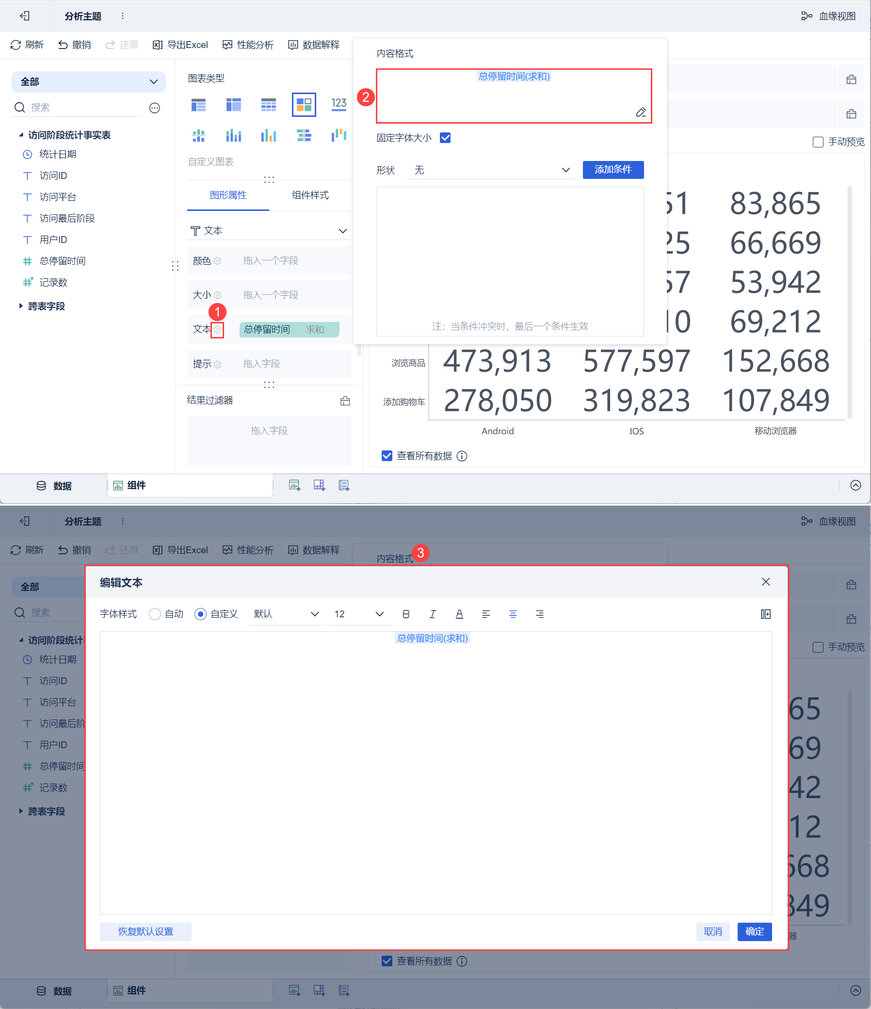 3)将左侧待分析区域的「访问平台」拖入分析区域的横轴,「访问最后阶段」字段拖入纵轴,「总停留时间」字段拖入到「图形属性」下的文本栏,如下图所示: