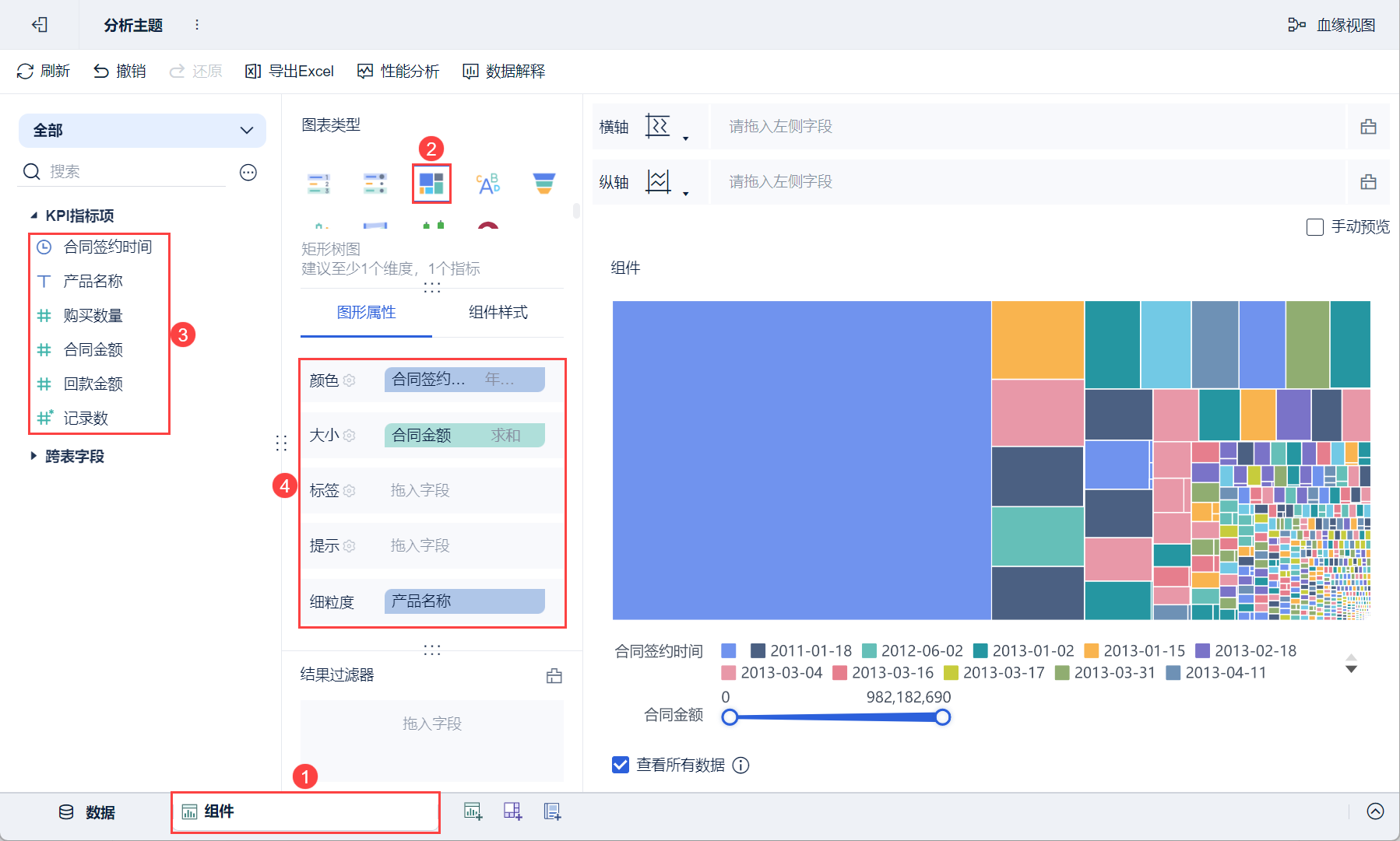 3)将左侧待分析区域的「合同签约时间」拖入「图形属性」下的颜色栏,「合同金额」拖入大小栏,「产品名称」拖入细粒度栏,如下图所示: