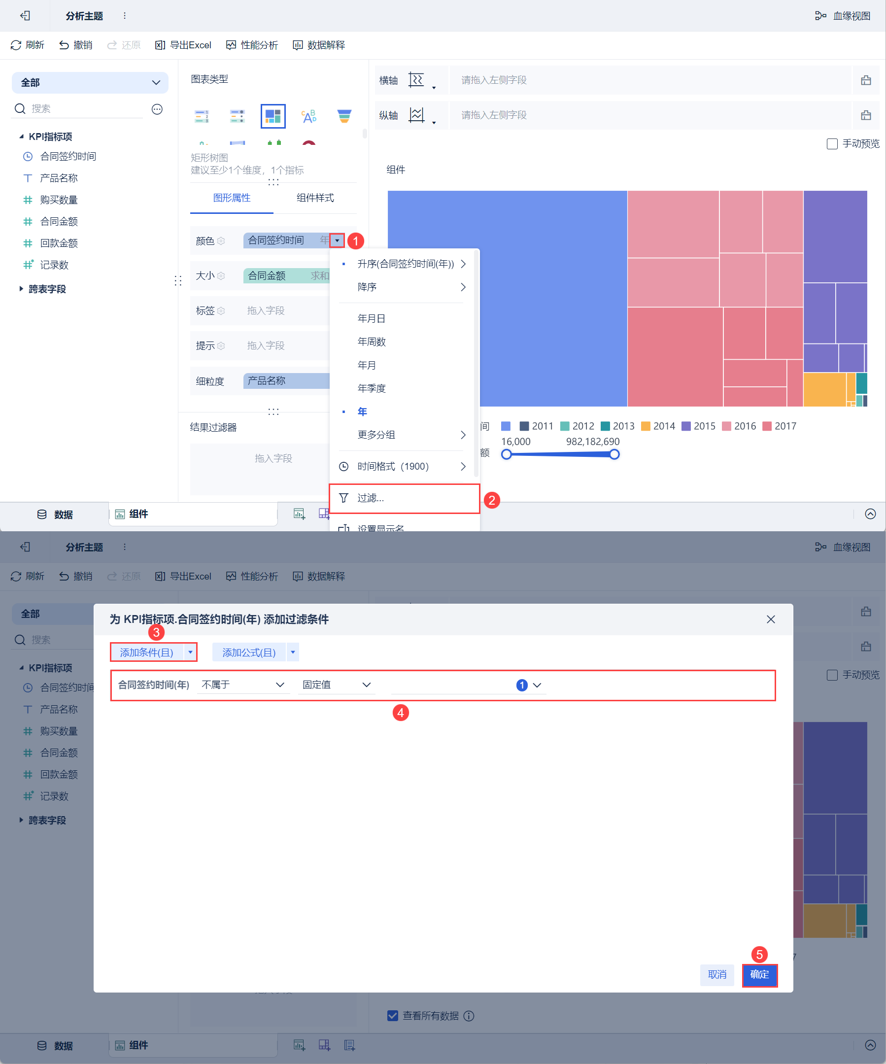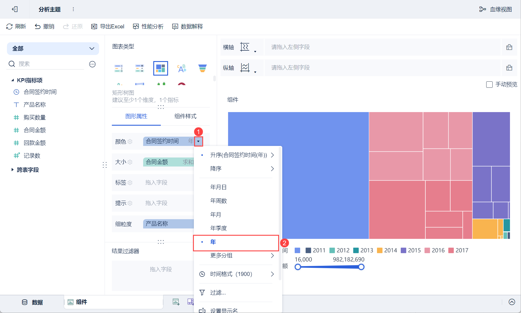 4)点击颜色栏「合同签约时间」的下拉按钮,设置其为「年」分组,如下图所示: