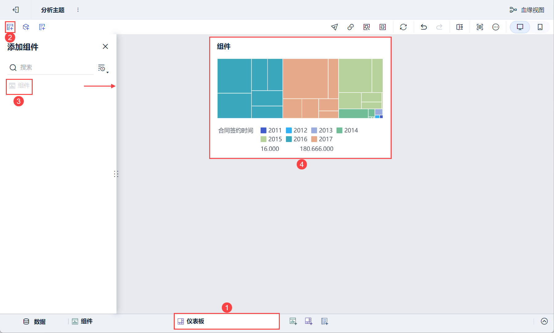 2)进入仪表板编辑界面,将组件拖入至仪表板中,如下图所示: