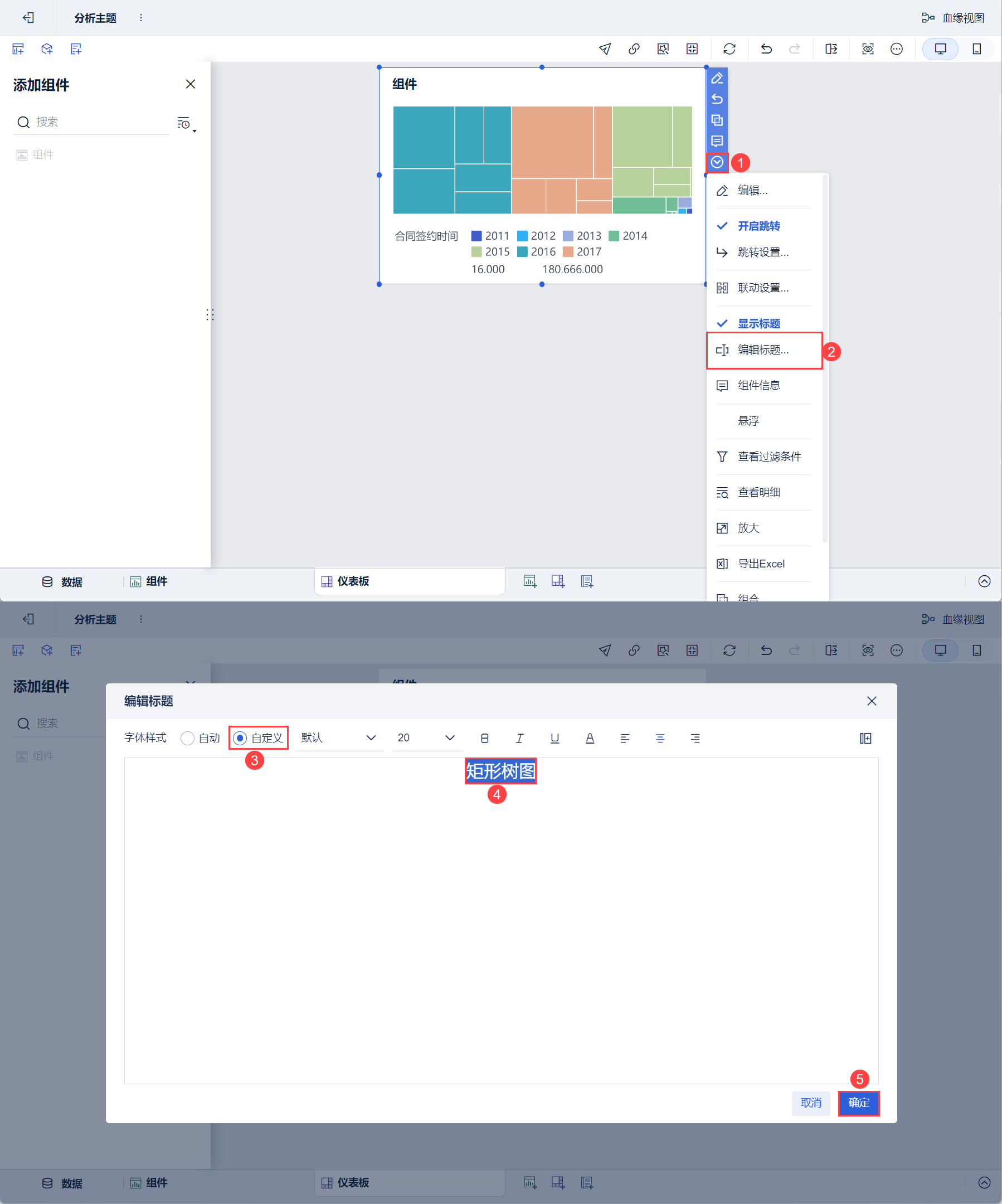 3)下拉选择「编辑标题」,样式选择「自定义」,设置标题为「矩形树图」,点击「确定」。如下图所示: