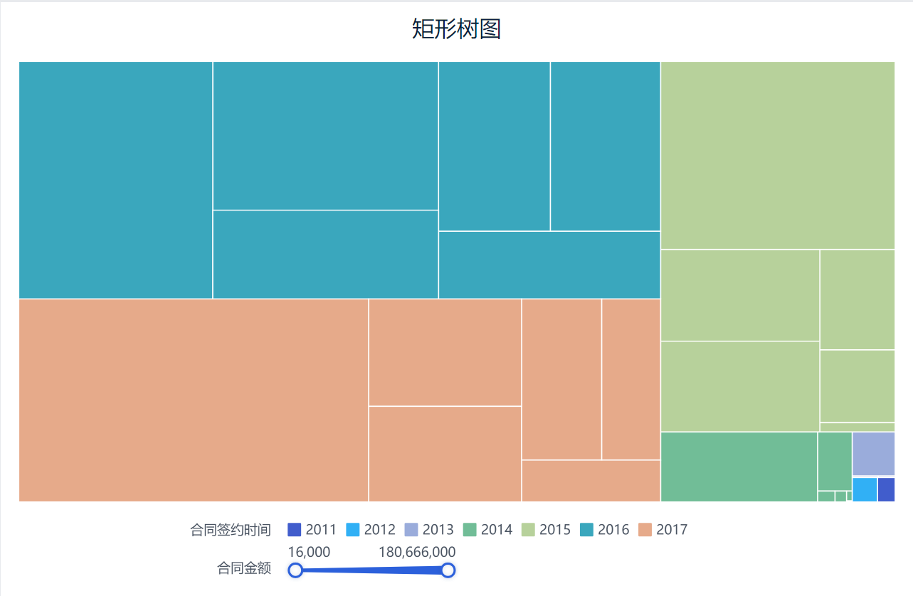 例如,用矩形树图展示合同金额的情况,同一种颜色表示一个年份,同一种颜色的每一个方块代表一类产品,某年某产品的合同金额的大小可以通过矩形块的大小直观展示,如下图所示: