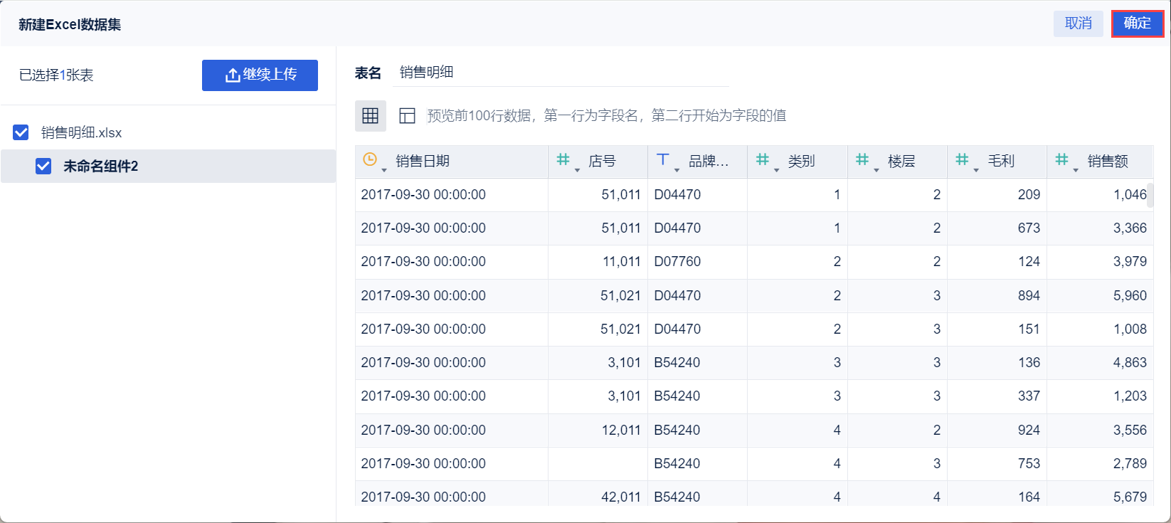 2)点击「本地Excel文件>上传数据」,上传表数据。如下图所示: