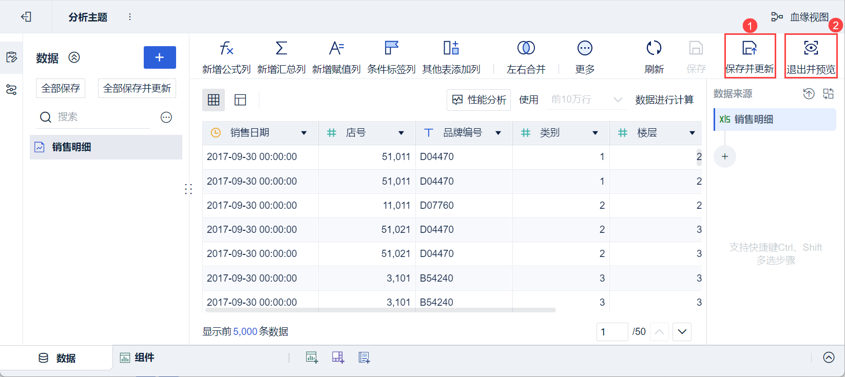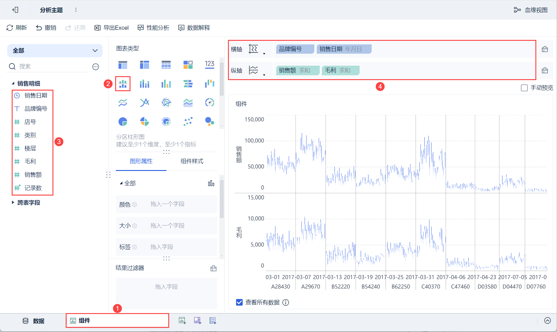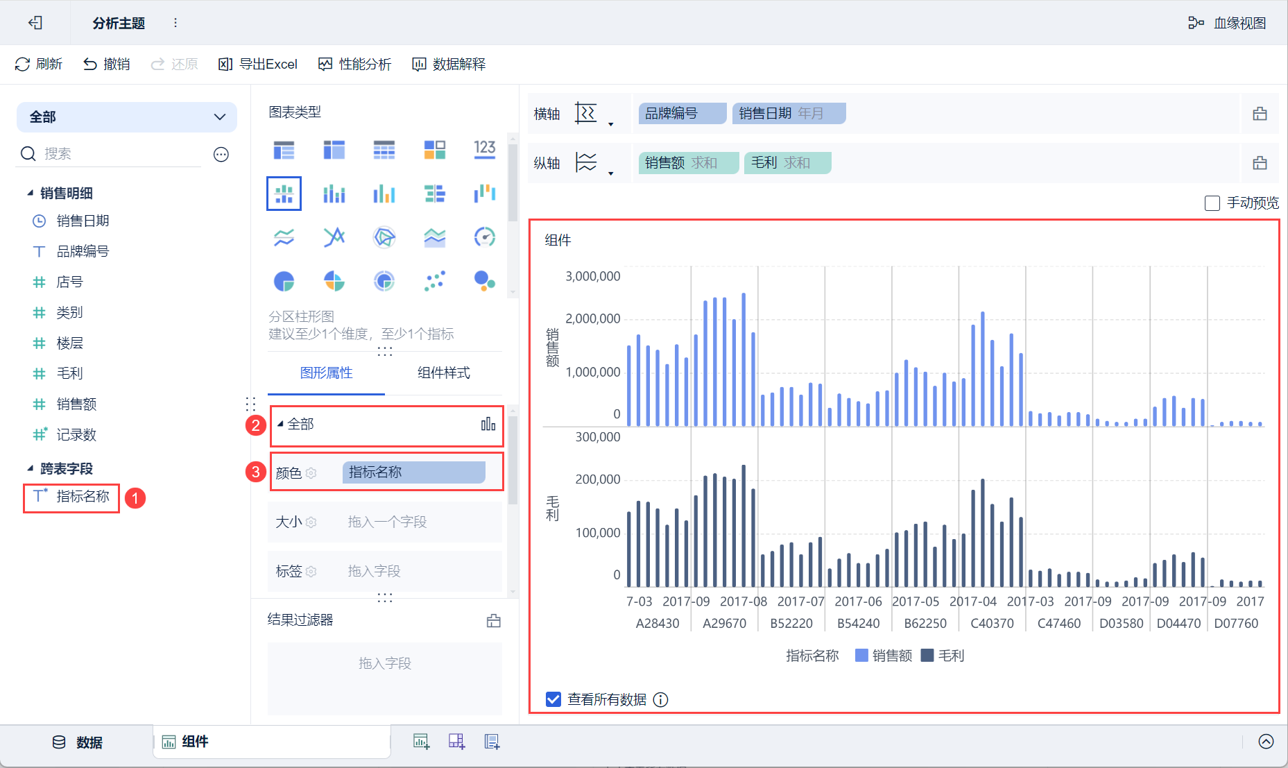 3)将左侧待分析区域的维度字段「品牌编号」、「销售日期」拖入分析区域的横轴,指标字段「销售额」、「毛利」拖入分析区域的纵轴,如下图所示:
