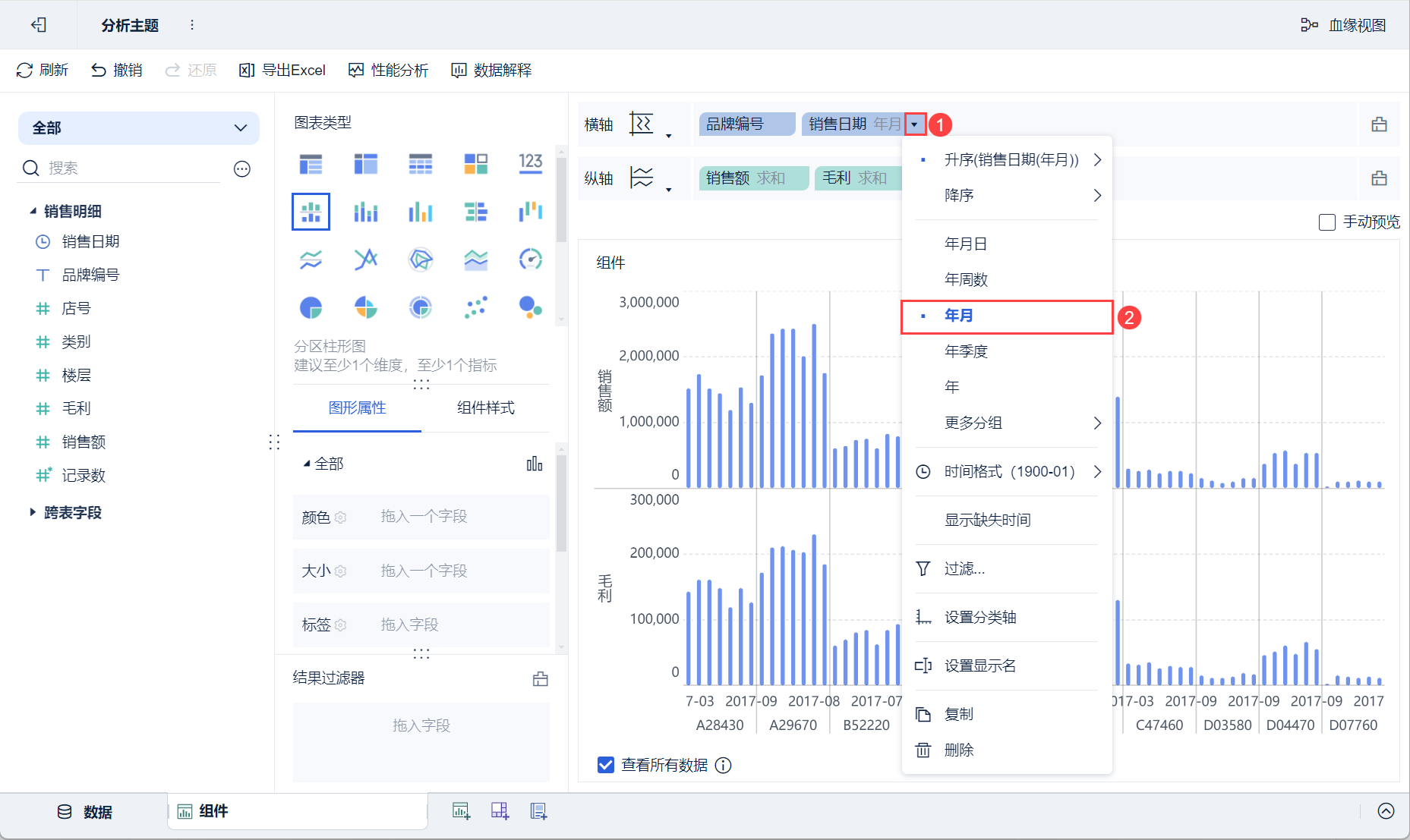 4)点击分析区域横轴「销售日期」的下拉按钮,选择其为「年月」分组,如下图所示:
