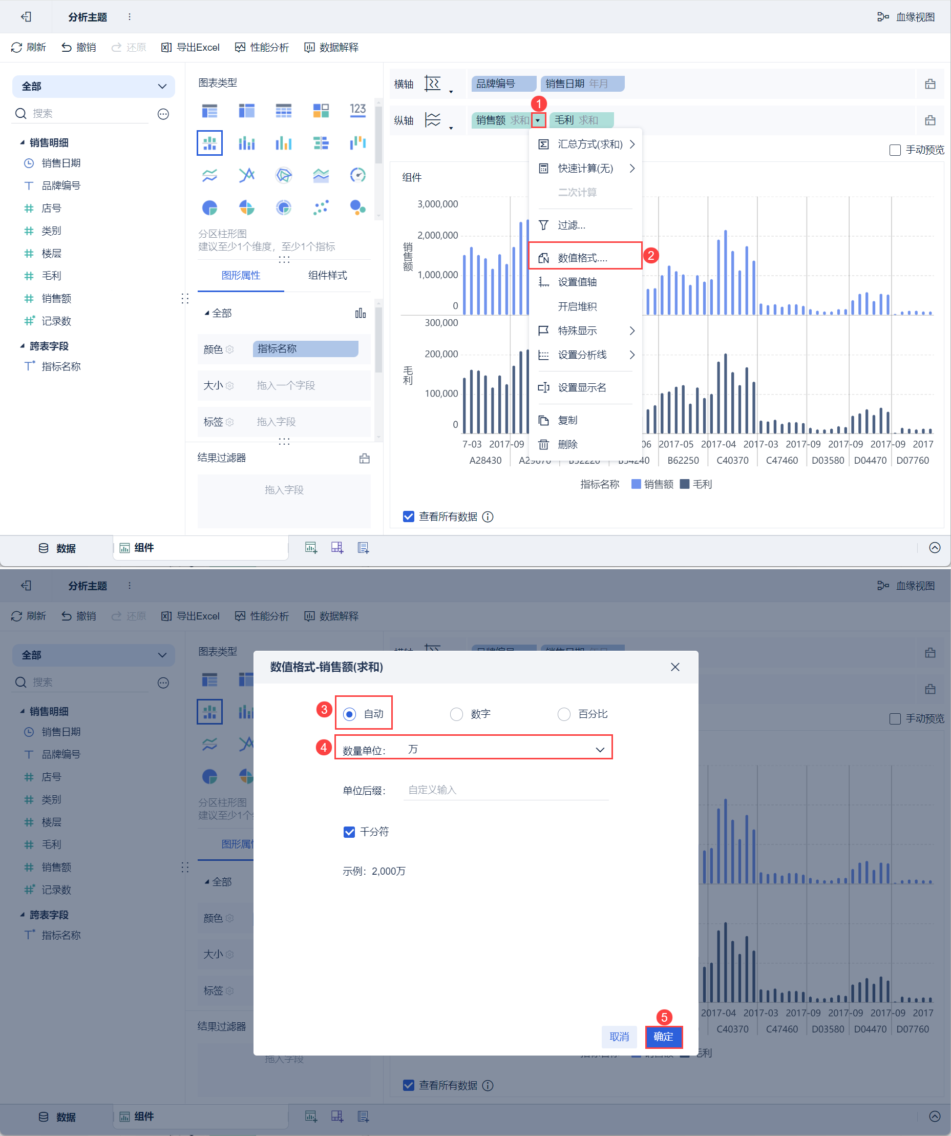 • 点击分析区域纵轴「销售额」字段的下拉按钮,选择「数值格式」,在弹出的设置框中勾选「自动」,数量单位选择「万」,点击「确定」,如下图所示: