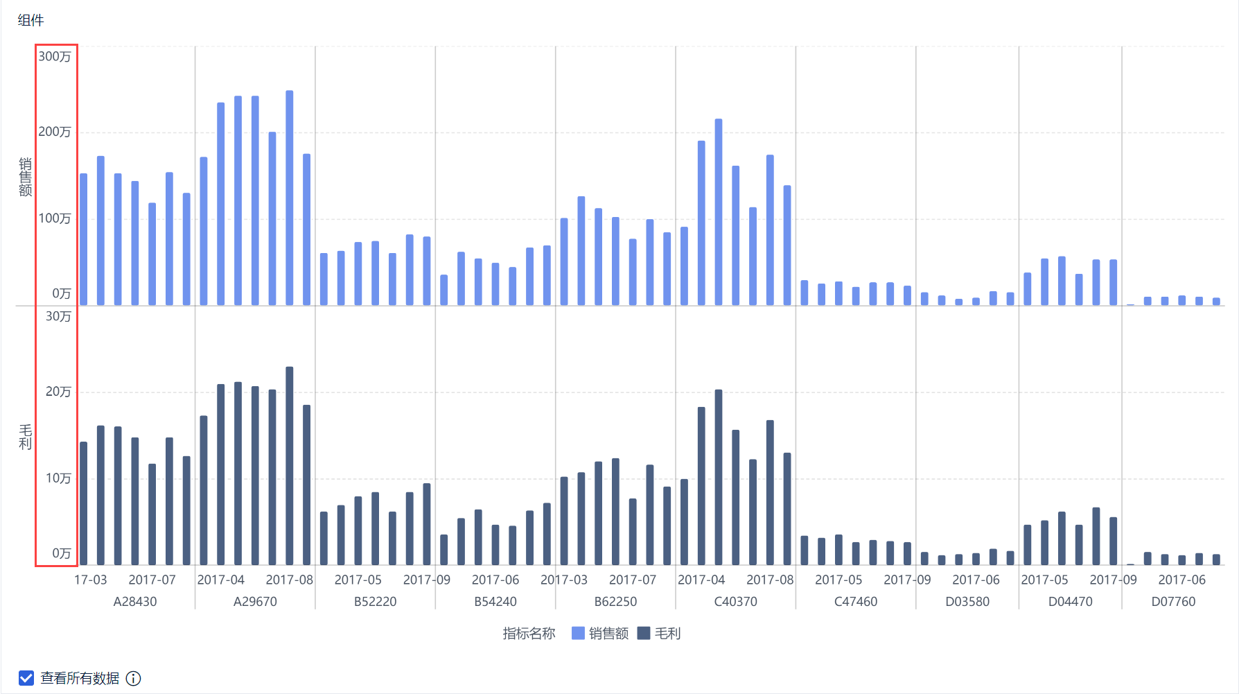 例如,用分区柱形图展示不同品牌2017年3-9月的销售额和毛利额,如下图所示: