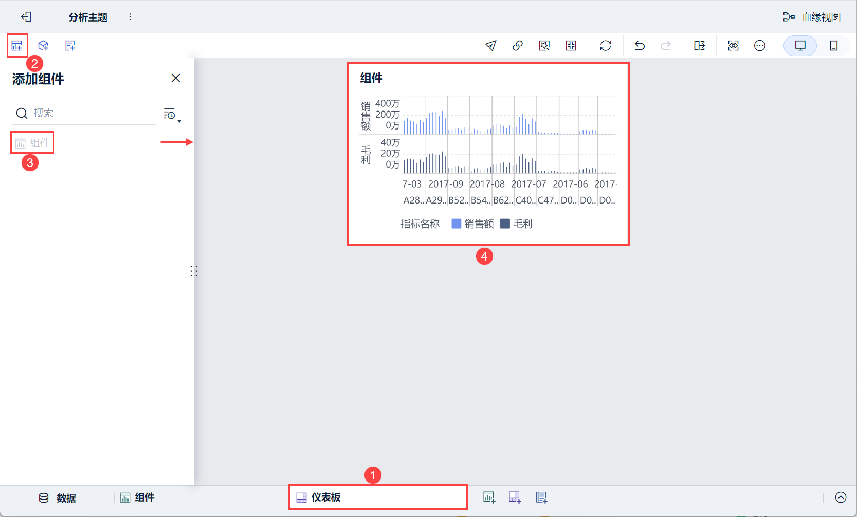 2)进入仪表板编辑界面,将组件拖入至仪表板中,如下图所示: