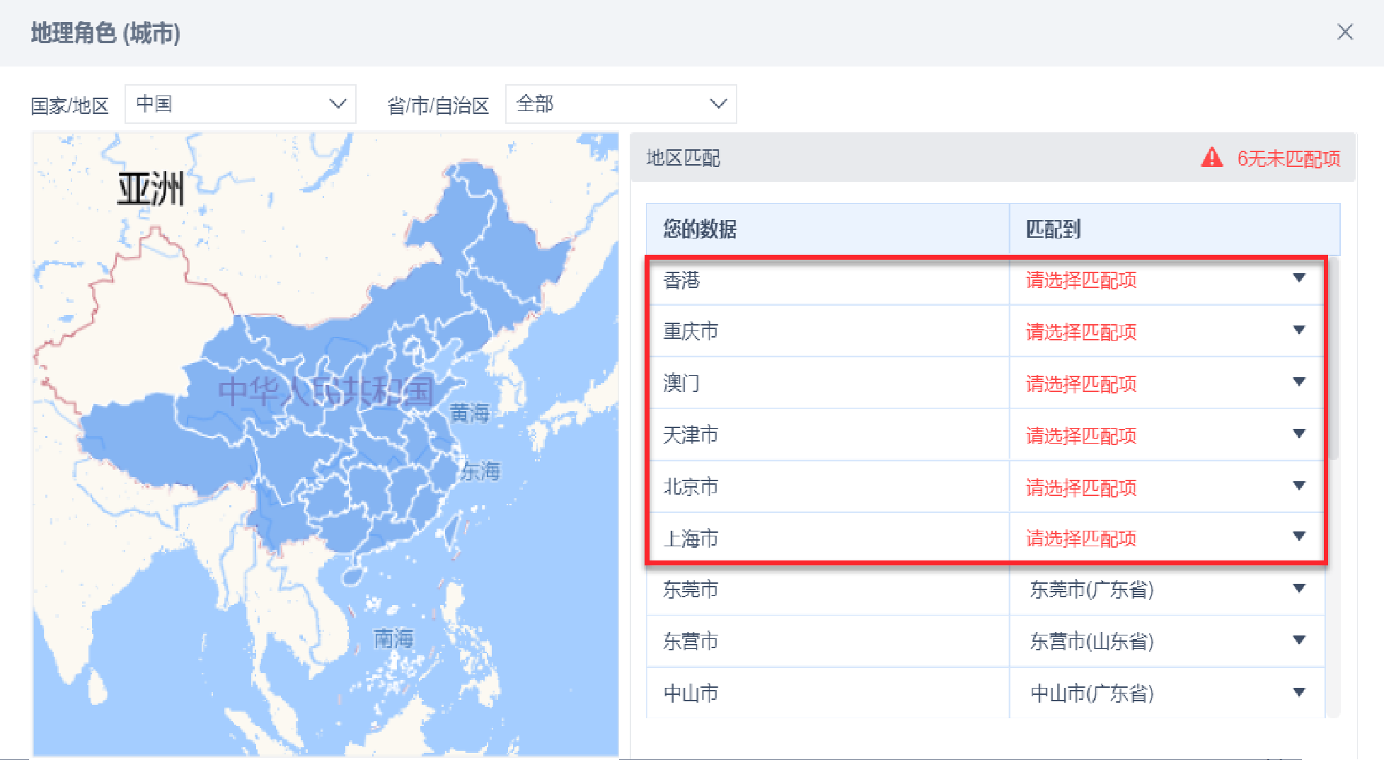 用户制作地图时想把这些地区跟地级市放在一起,但是作为省份级别是无法跟地级市进行匹配的。如下图所示: