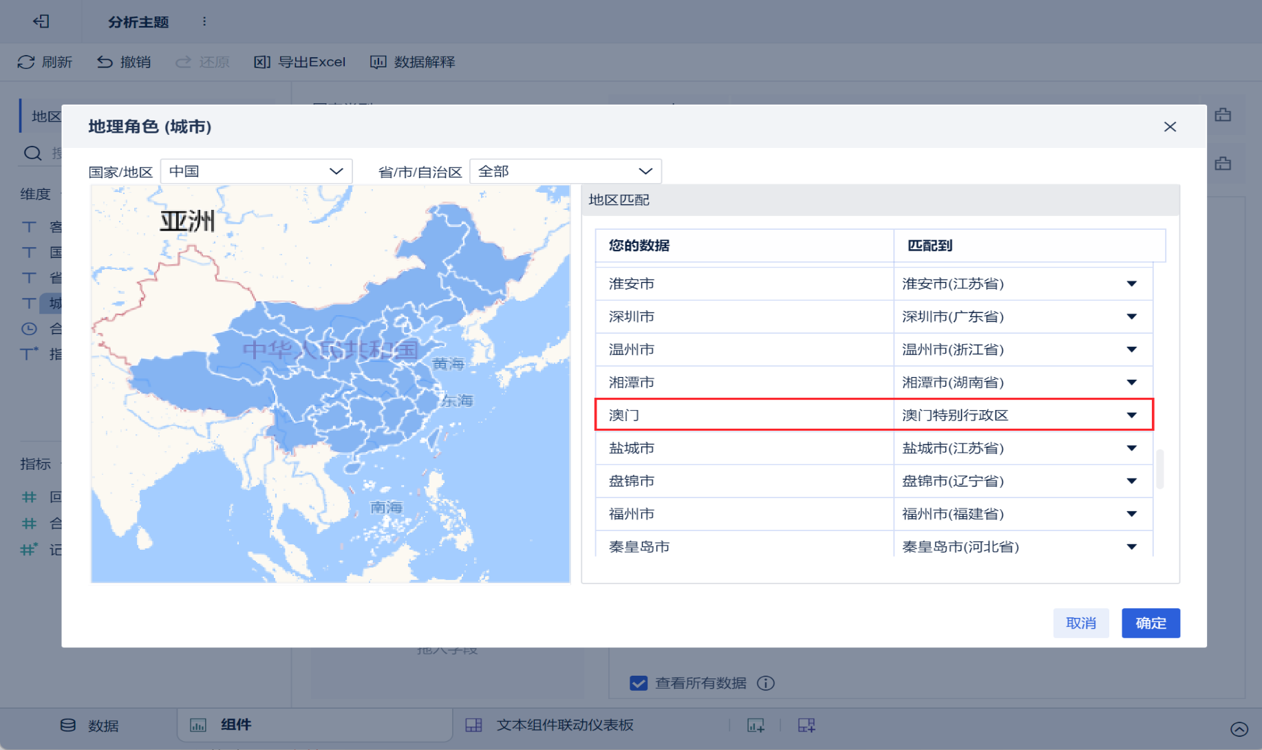 2)可以看到,城市字段中的澳门可以跟地级市级别的澳门特别行政区进行匹配。如下图所示: