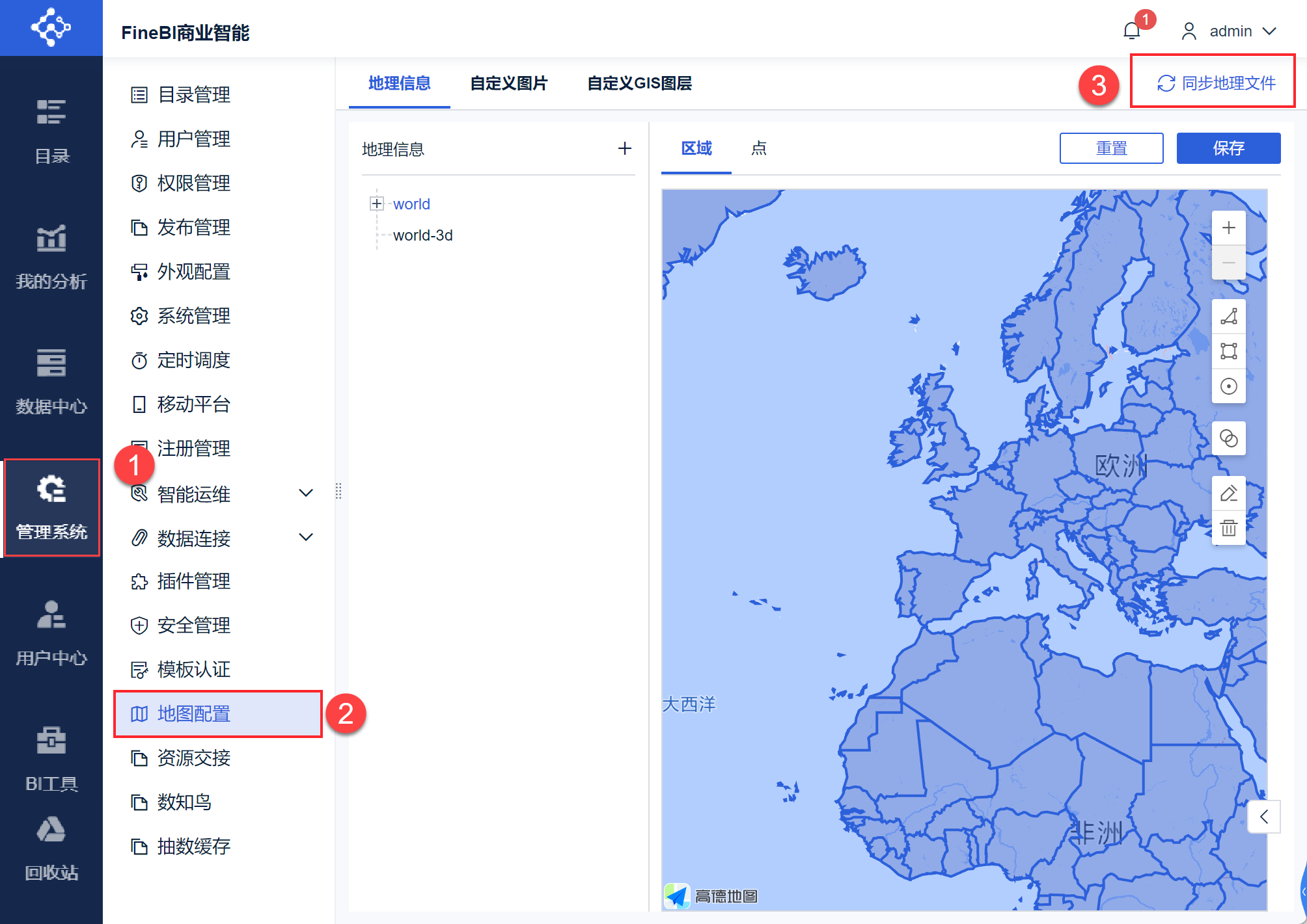 管理员进入平台,点击「管理系统>地图配置>同步地理文件」即可。如下图所示: