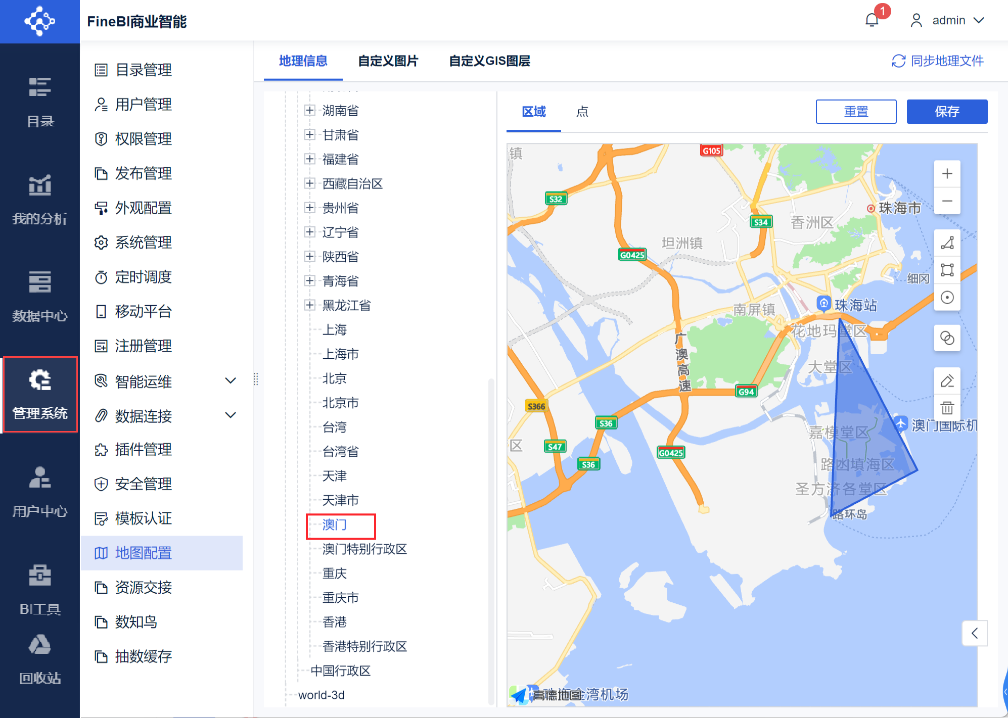 进入 FineBI 决策平台,「管理系统>地图配置>地理信息>区域」下新增地级市级别的澳门。如下图所示: