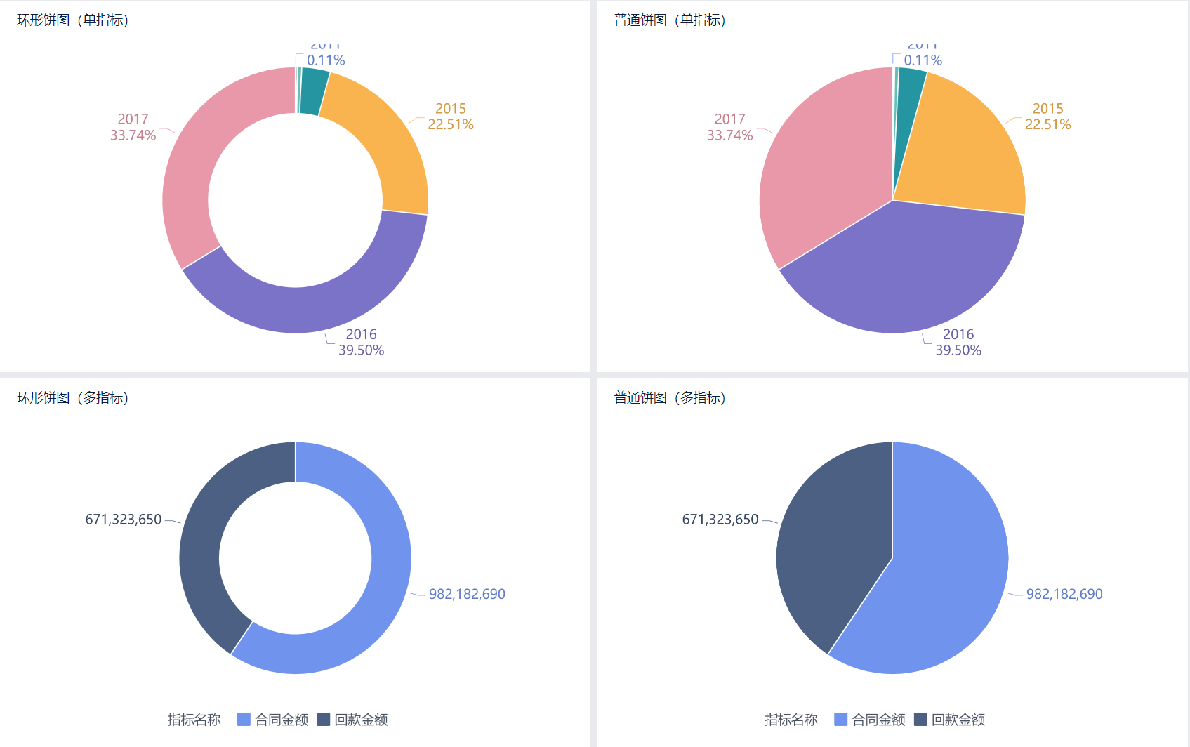 例如,分别用环形饼图(单指标)和普通饼图(单指标)展示不同签约时间的合同金额所占的比例,环形饼图(多指标)和普通饼图(多指标)展示不同指标的数值大小,如下图所示: