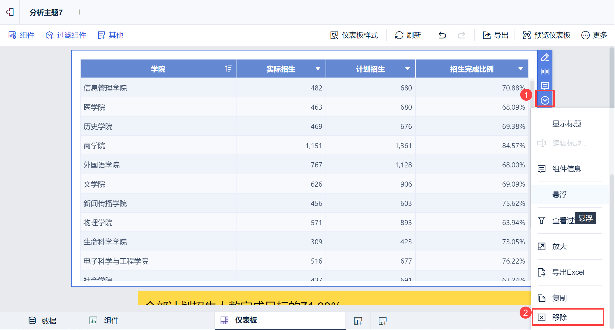 将组件添加至仪表板后,想要移除组件,不让该组件显示在仪表板,可以进行如下操作: