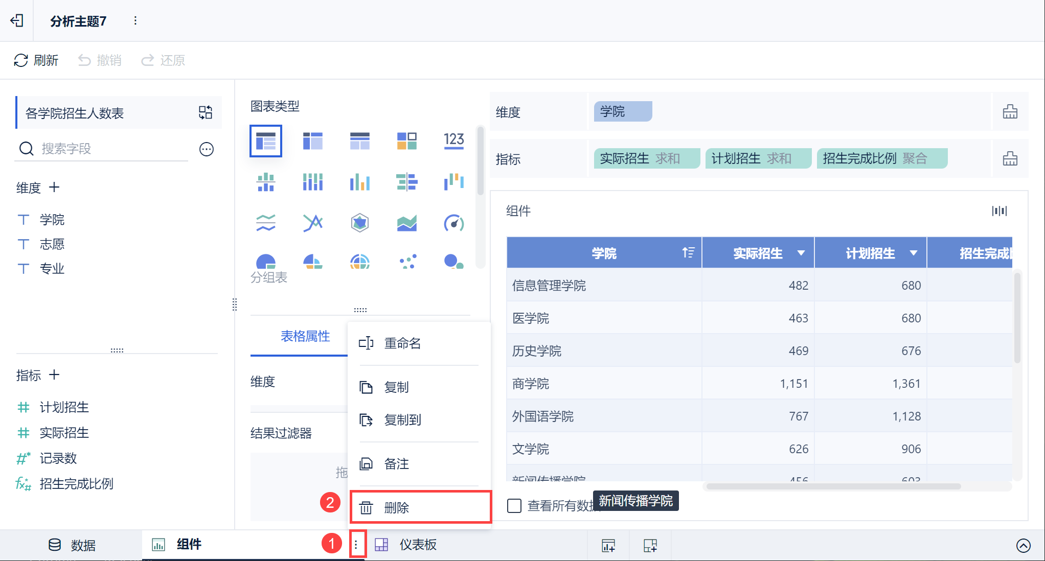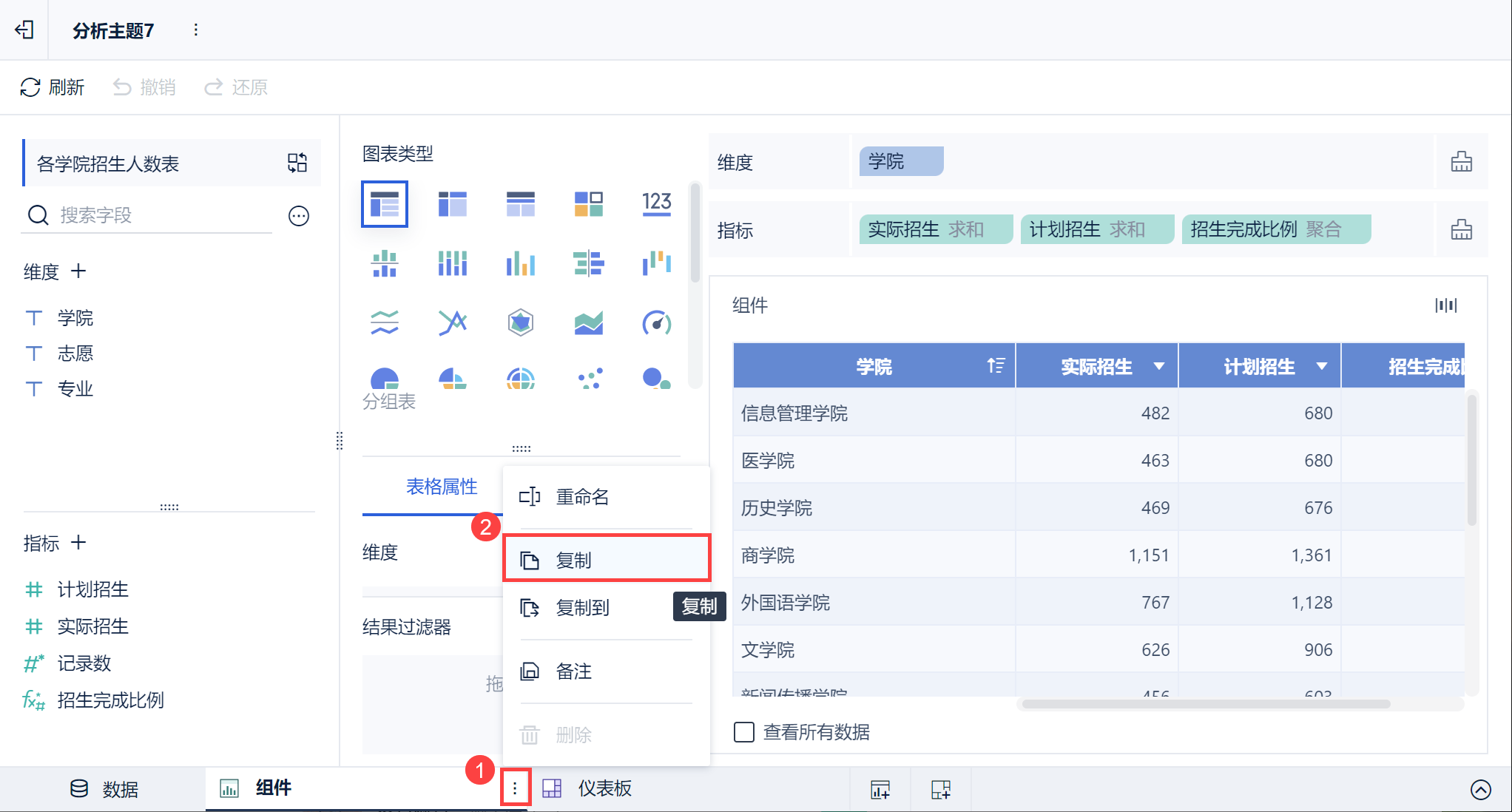 若是想在当前分析主题中复制一个一模一样的组件,就可以使用复制功能。