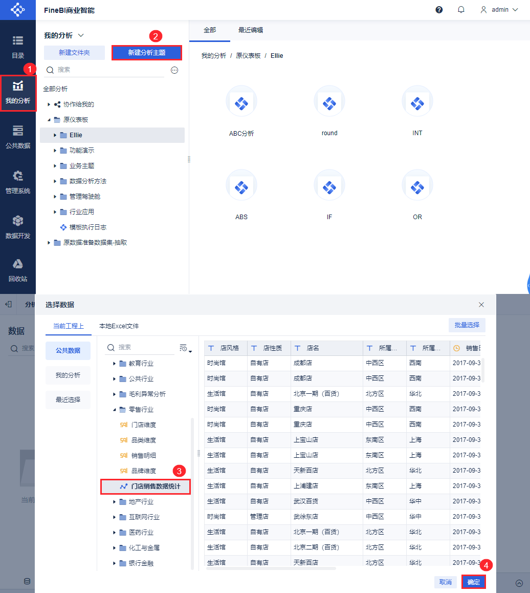 1)在「我的分析」下创建「帕累托分析」主题,选择内置公共数据中的「门店销售数据统计」,点击「确定」添加数据,如下图所示: