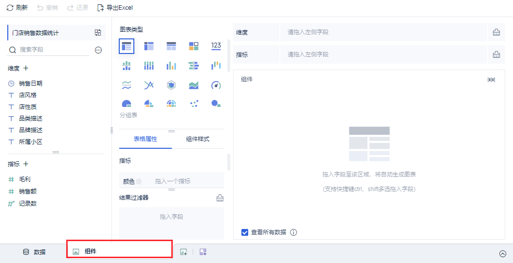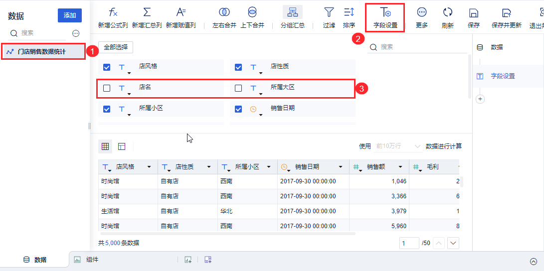 1)在主题中添加数据表「门店销售数据统计」,点击「字段设置」取消勾选「店名」和「所属大区」,如下图所示: