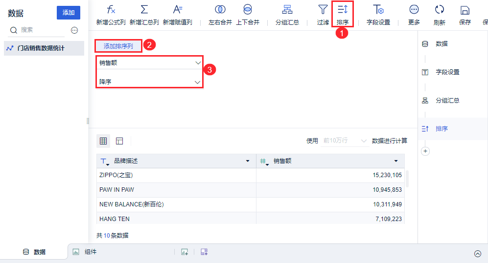 将「品牌描述」根据「销售额」进行「降序」排列,如下图所示: