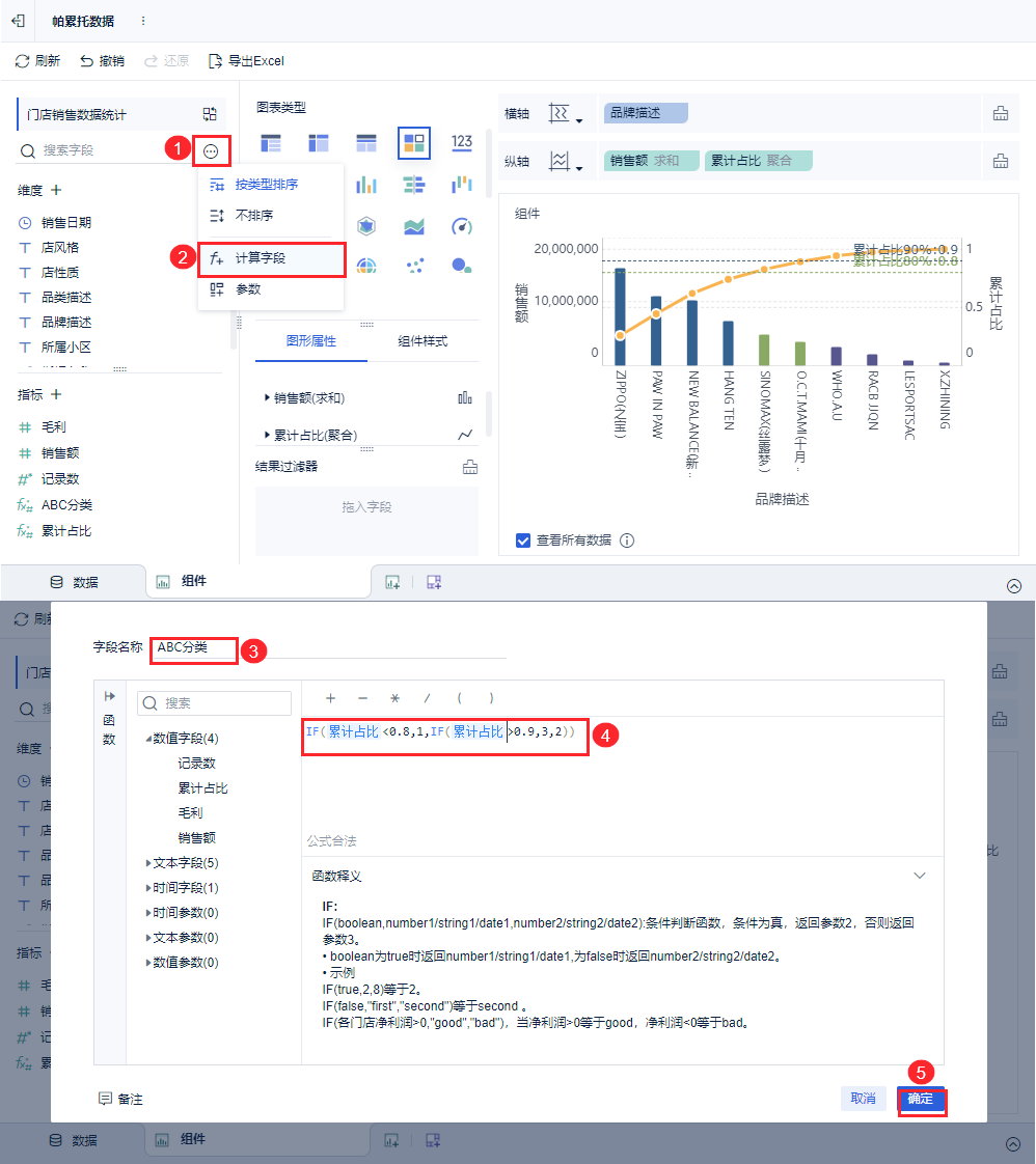 1)添加计算指标,命名为「 ABC 分类」,输入公式 IF(累计占比<0.8,1,IF(累计占比>0.9,3,2)) ,其中 1 代表 A 类商品,2 代表 B 类商品,3 代表 C 类商品。如下图所示: