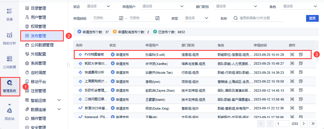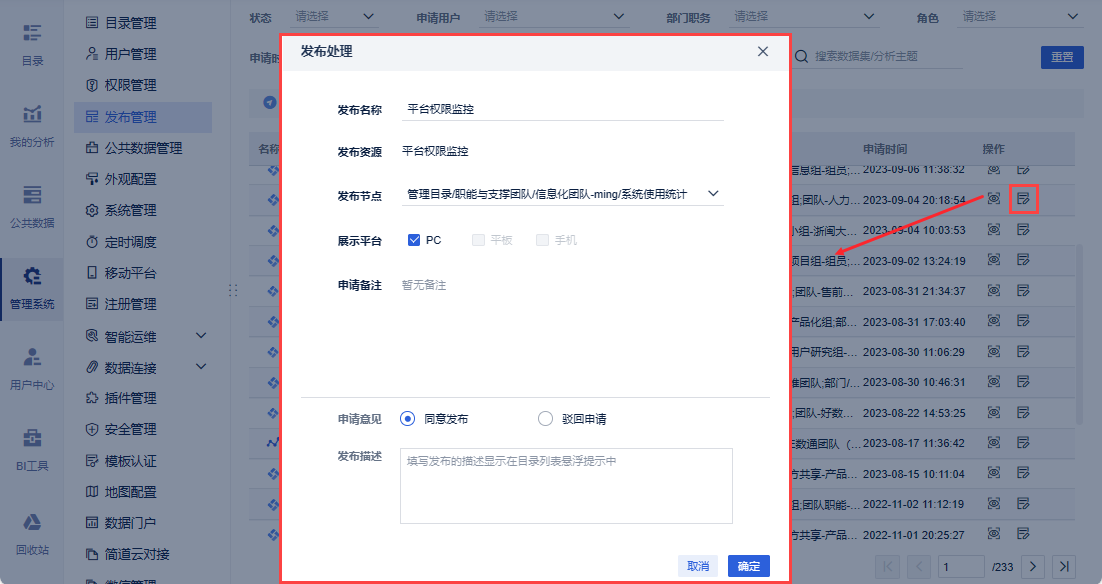 管理员进入「管理系统>发布管理」,即可在此处对申请发布和取消发布的资源进行管理,如下图所示: