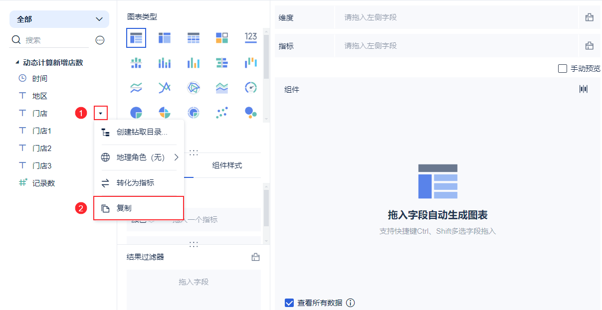 1)进入组件编辑界面,复制门店字段,如下图所示: