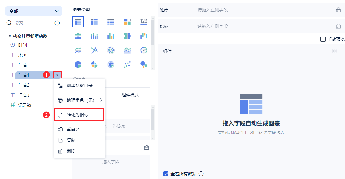 2)将复制的「门店 1」、「门店 2」、「门店 3」字段「转化为指标」,如下图所示: