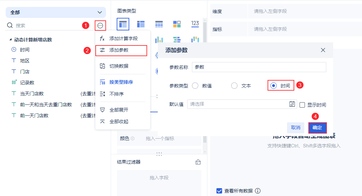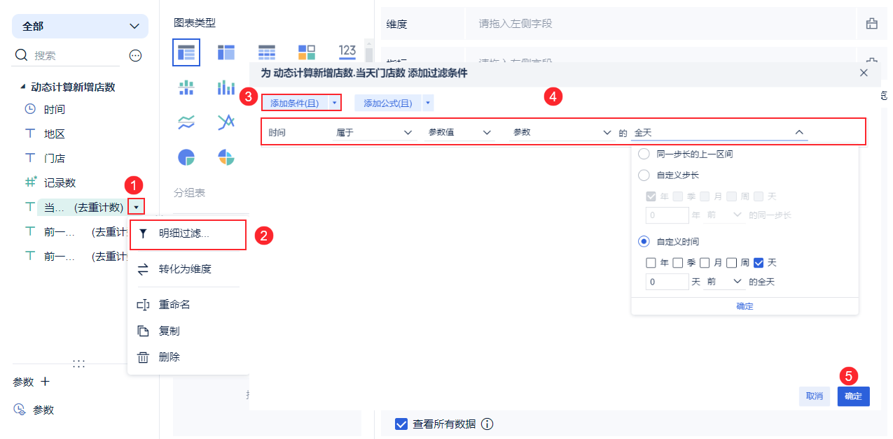 1)将「当天门店数」绑定「参数」,设置过滤条件为「自定义时间」的「全天」,如下图所示: