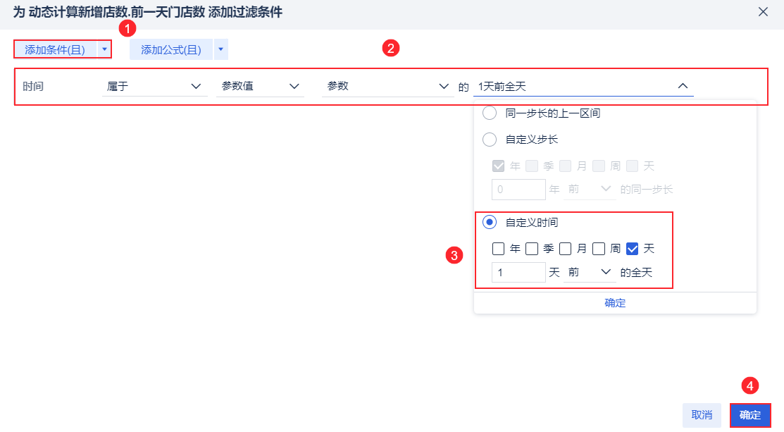 2)将「前一天门店数」绑定「参数」,设置过滤条件为「自定义时间」的「一天前全天」,如下图所示: