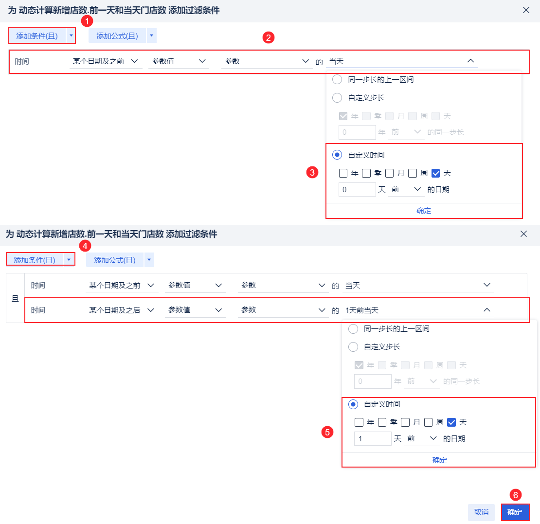 3)将「前一天和当天去重门店数」绑定「参数」,设置过滤条件为某个日期及之前以及某个日期及之后,如下图所示: